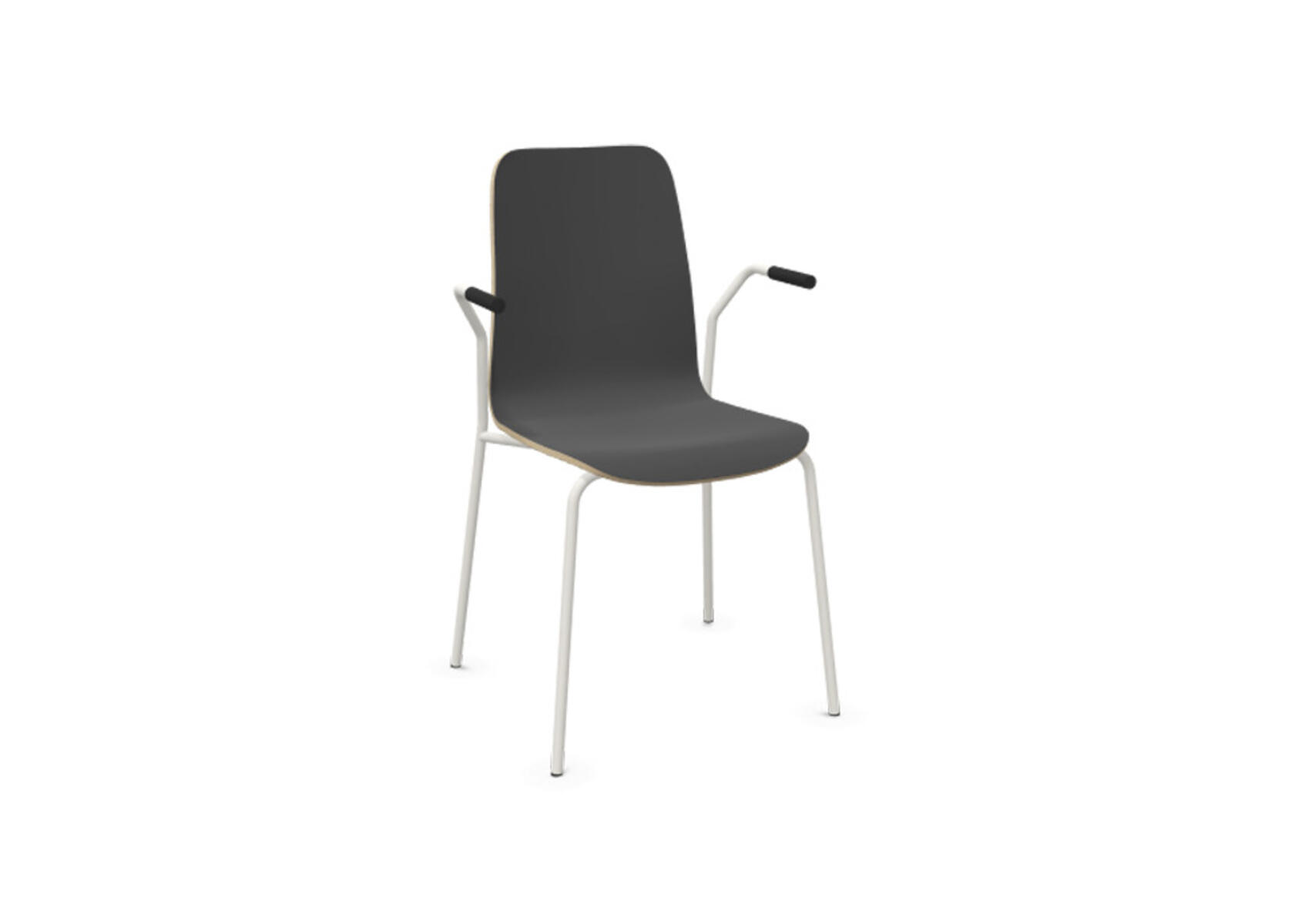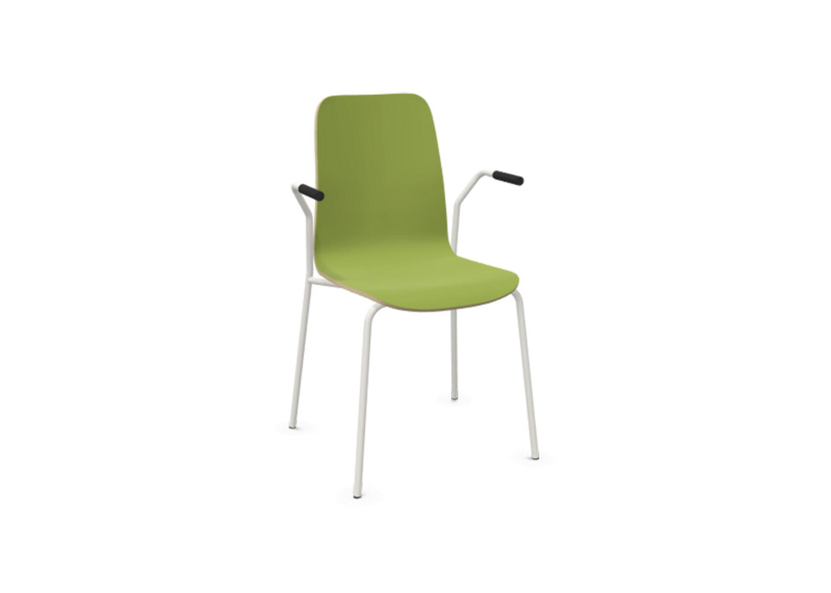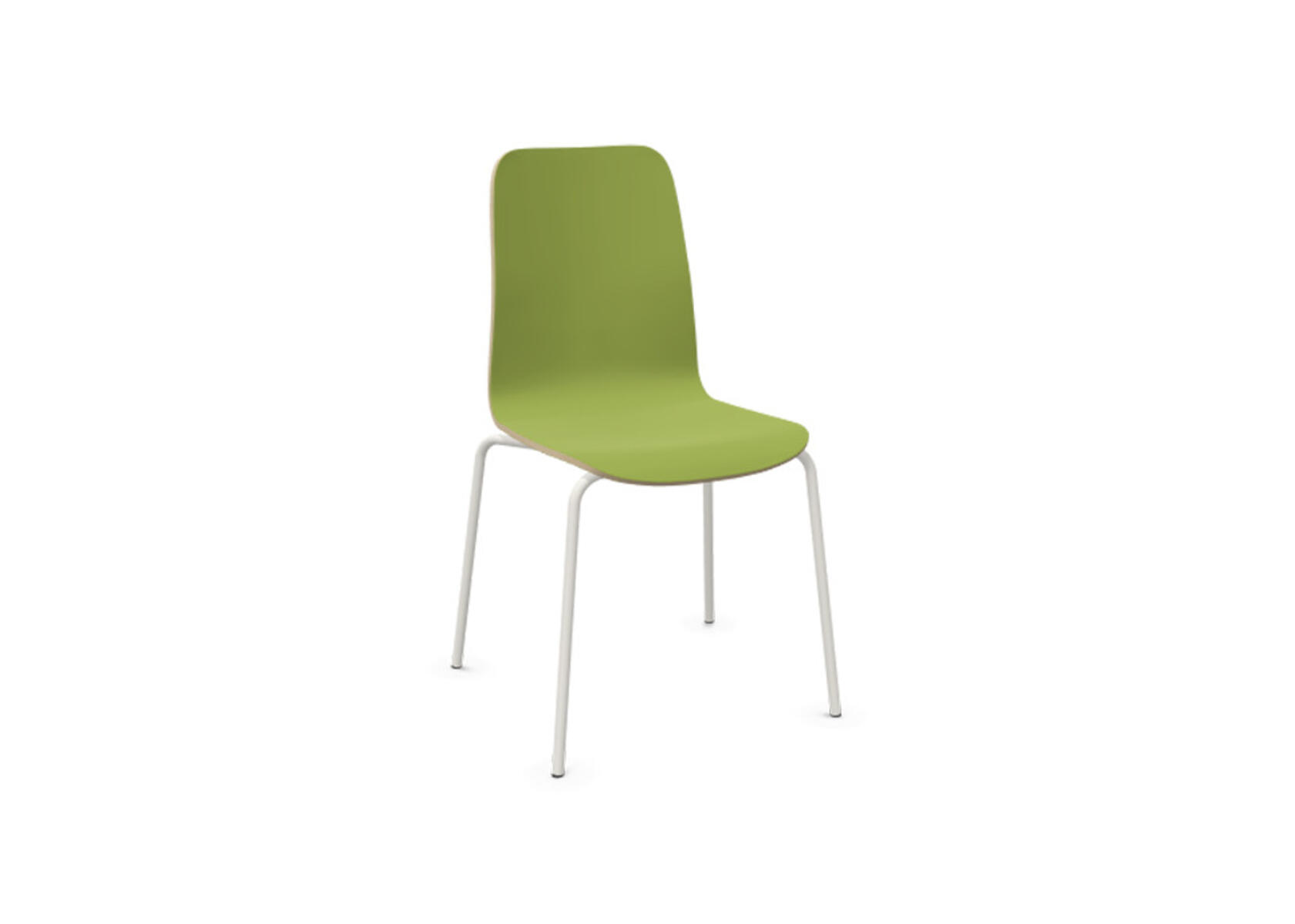 Sittskal i formpressad plywood belagd med högtryckslaminat. Stabilt pulverlackat stativ av ø 18 mm rör med möbeltassar för att skydda golvet. Armstöd finns som tillval. För ännu större flexibilitet finns kopplingsbeslag samt radkopplingsbeslag (säljs separat) som gör det enkelt att skapa rader eller gruppsittningar. Maxvikt 110 kg. Stolen är stapelbar upp till 6 enheter.