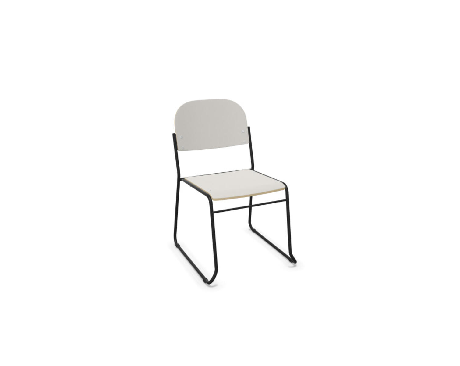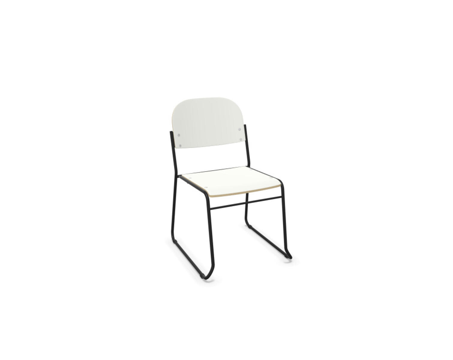 Nätt och stilren stol. Stapelbar upp till 10 st. Kopplingsbeslag och stolsvagn kan köpas separat. Sits och rygg av formpressad plywood belagd med högtryckslaminat. Pulverlackat stativ av ø 16 mm rör med möbeltassar.