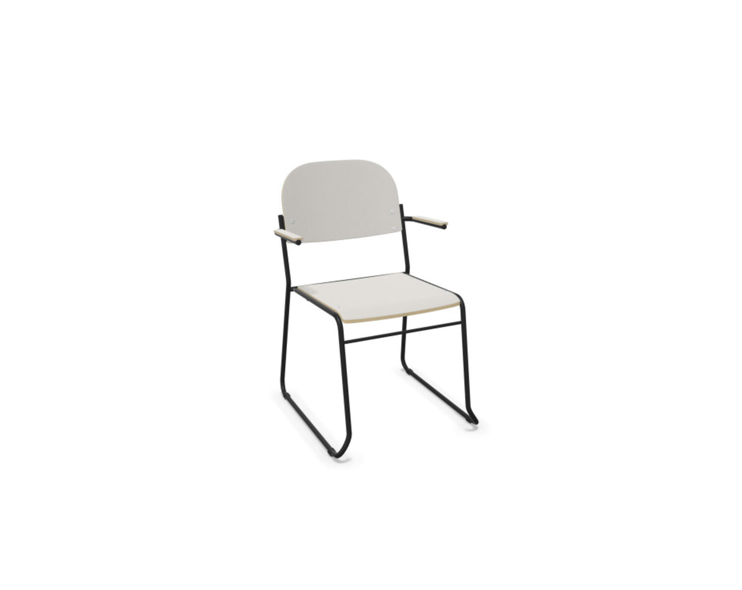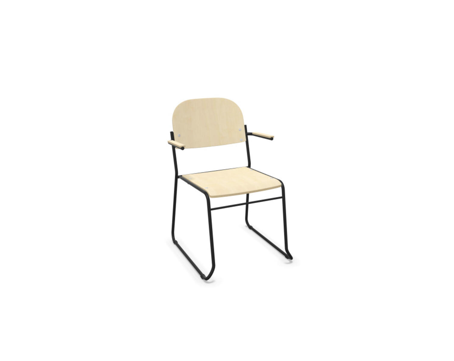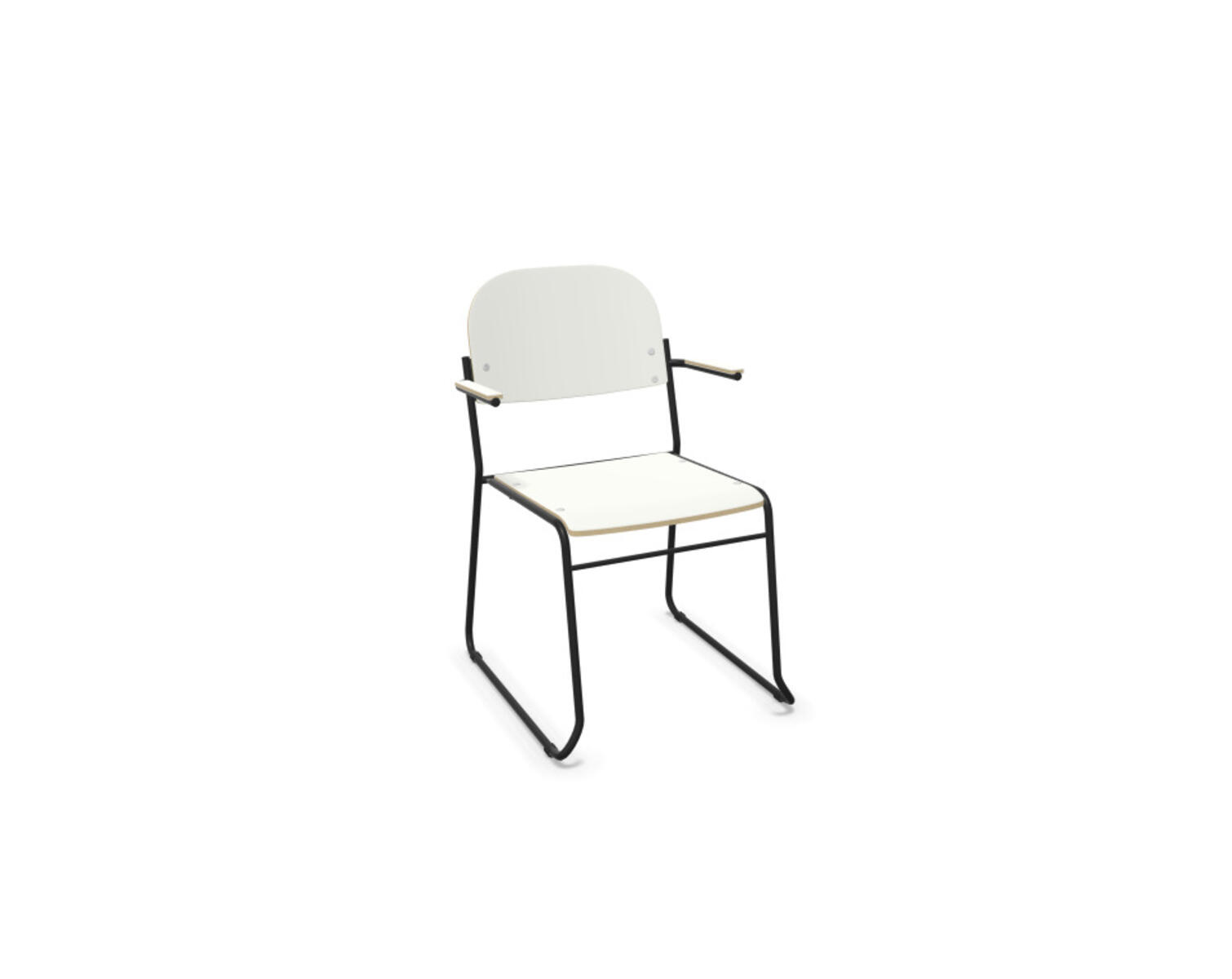 Nätt och stilren stol. Stapelbar upp till 10 st. Kopplingsbeslag och stolsvagn kan köpas separat. Sits och rygg av formpressad plywood belagd med högtryckslaminat. Armstöd möjliggör upphängning på bord. Pulverlackat stativ av ø 16 mm rör med möbeltassar.