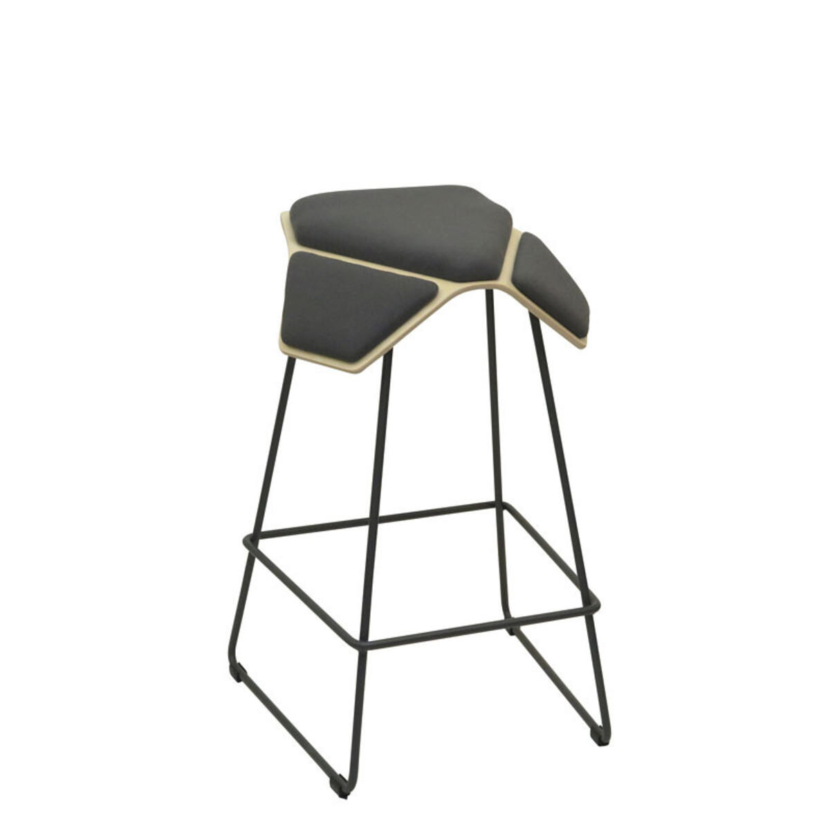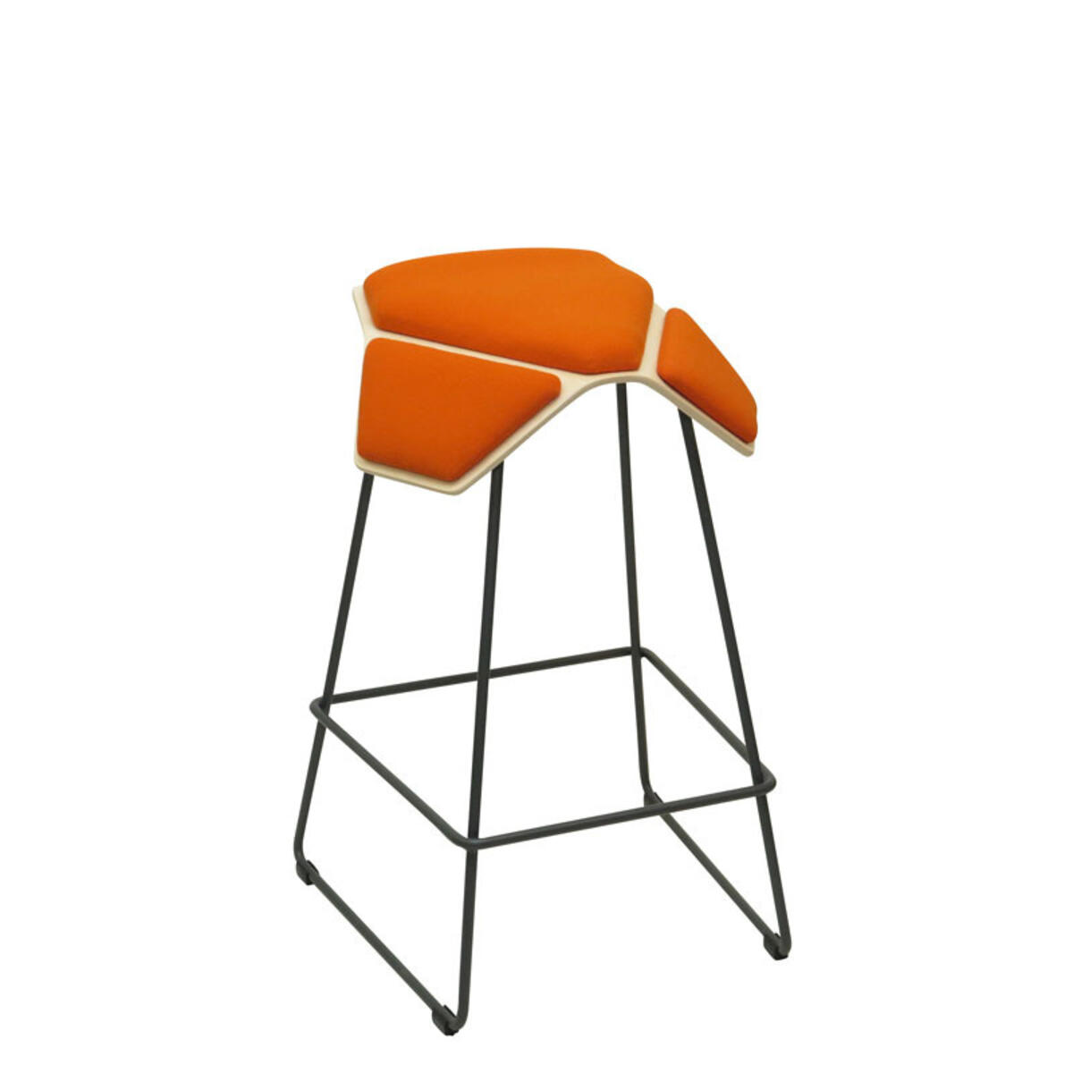 Finsk design av Jonas Hakaniemi. Formpressad sits i björk med 4 cm hög sittdyna överst och 2,5 cm hög dyna på sidorna klädd i tyg Fame, -96 (60999), -95 (60003) och -11 (63016). Tyg 95 % ull och 5 % polyamid. Svartlackerat stativ med möbeltassar.