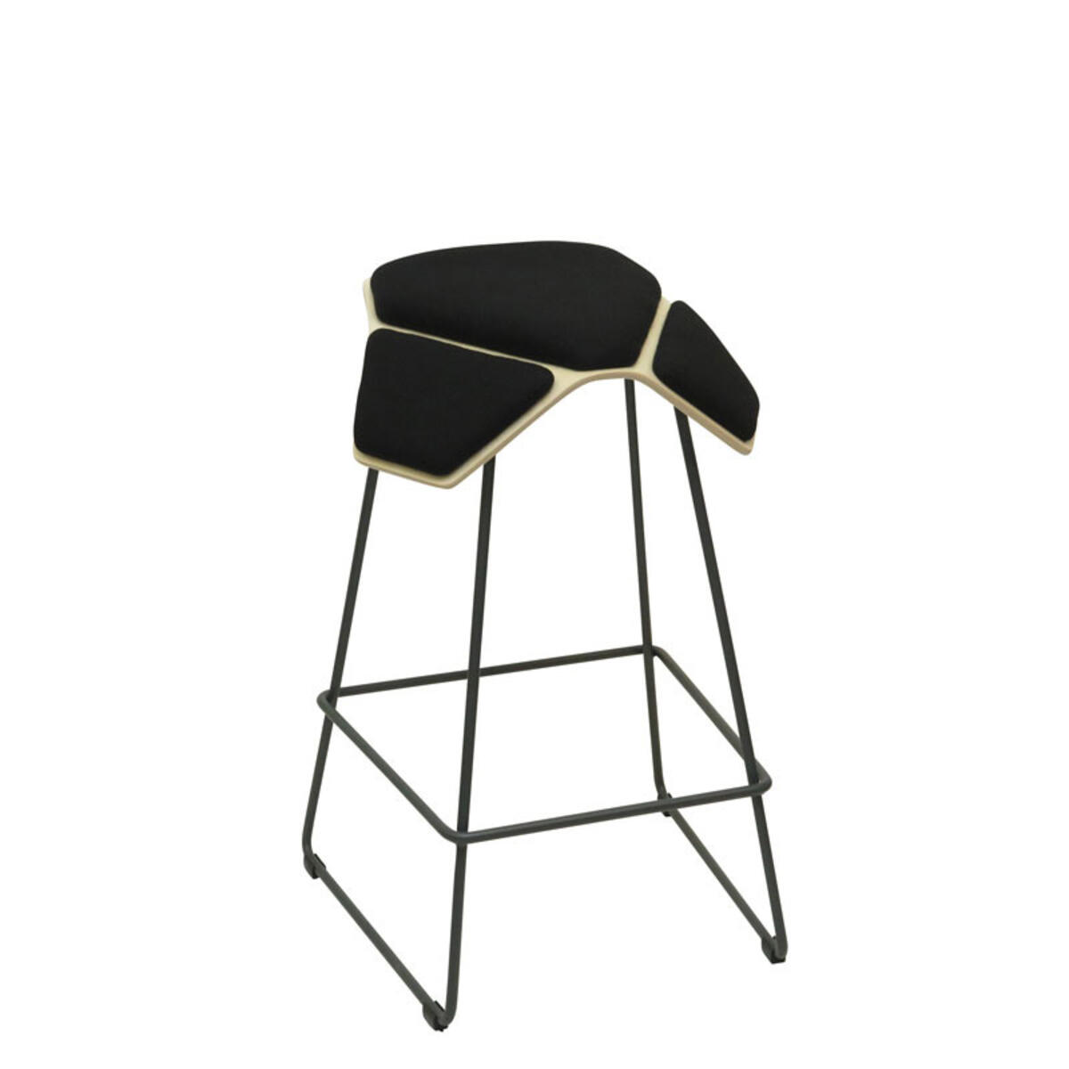 Finsk design av Jonas Hakaniemi. Formpressad sits i svartlaserad ask med 4 cm hög sittdyna överst och 2,5 cm hög dyna på sidorna klädd i tyg Fame, -96 (60999), -95 (60003) och -11 (63016). Tyg 95 % ull och 5 % polyamid. Svartlackerat stativ med möbeltassar.