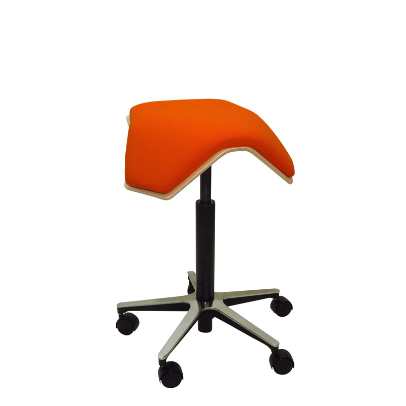 Bekväm och ergonomisk sadelstol, inklusive ryggstöd. Ställbar sitthöjd 35–44 cm. Totaldiameter på sits 32 cm. Totaldiameter på fotkryss 55 cm. Sits i konstläder med stoppning.