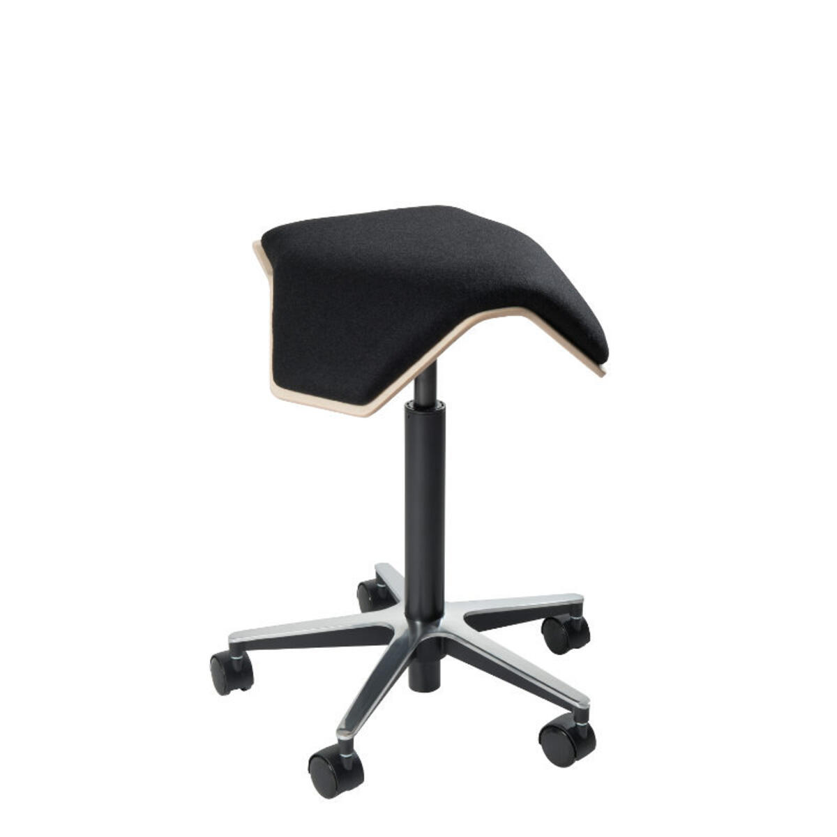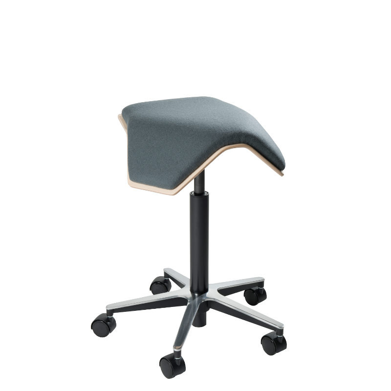 Sadelstol klädd i konstläder. Kallskum. Ställbar steglös sitsvinkel, 12° framåt och 1° bakåt. Sitthöjd 58–77 cm med gasfjäder. Sitsmått: B38,5xD29 cm. Aluminiumkryss.