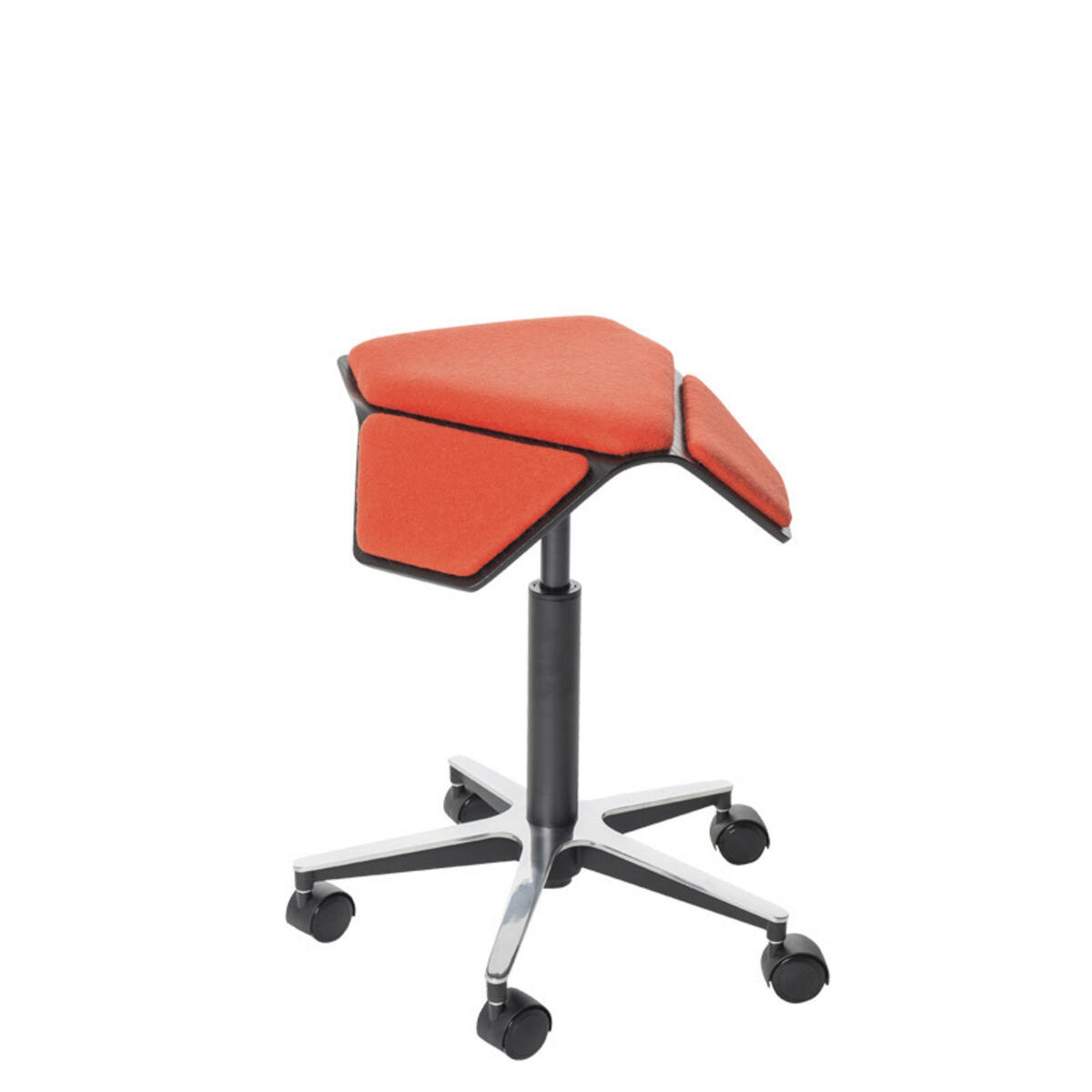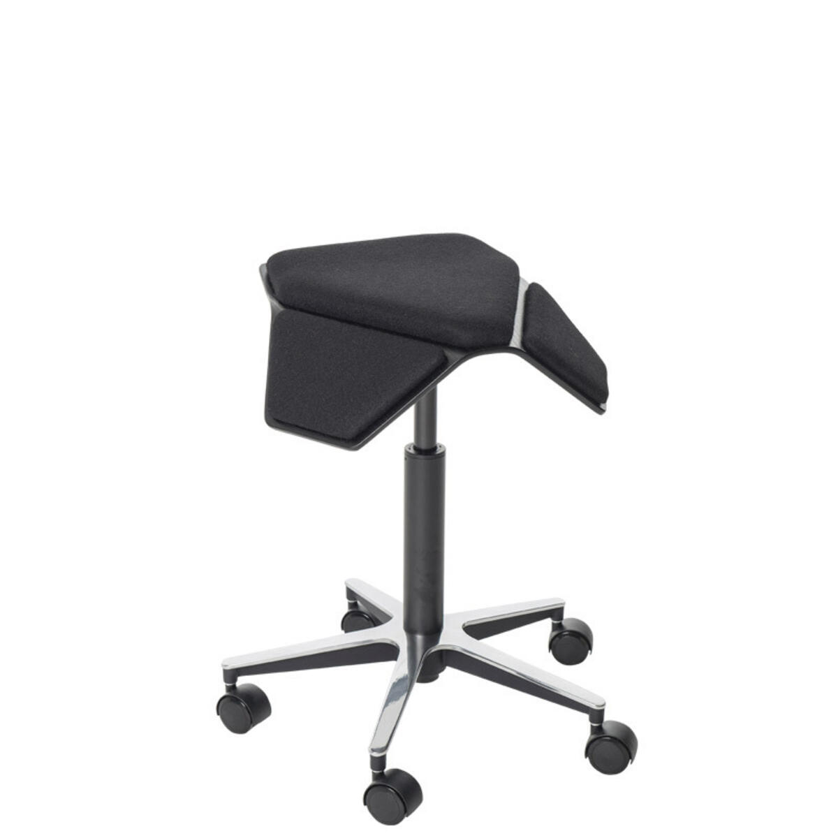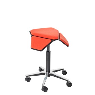 Bekväm och ergonomisk sadelstol, inklusive ryggstöd. Ställbar sitthöjd 35–44 cm. Totaldiameter på sits 32 cm. Totaldiameter på fotkryss 55 cm. Sits i konstläder med stoppning.