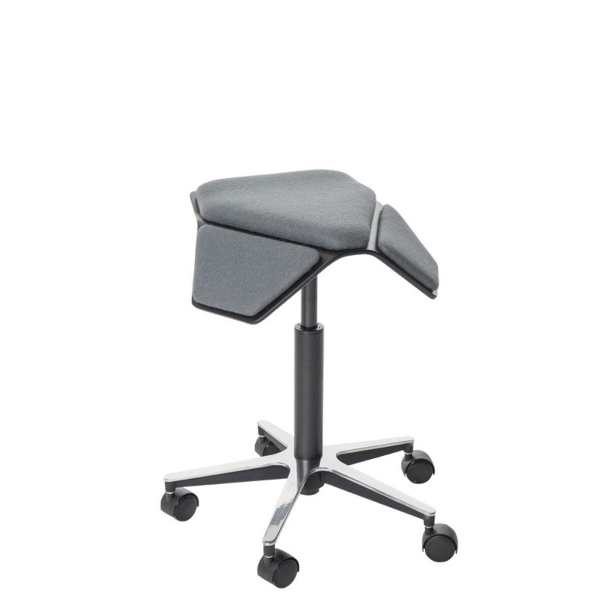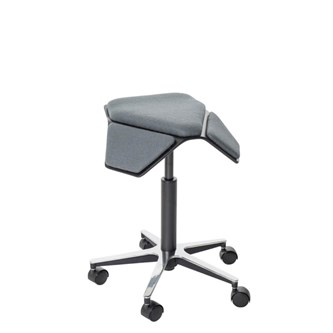 Sadelstol klädd i konstläder. Kallskum. Ställbar steglös sitsvinkel, 12° framåt och 1° bakåt. Sitthöjd 58–77 cm med gasfjäder. Sitsmått: B38,5xD29 cm. Aluminiumkryss.
