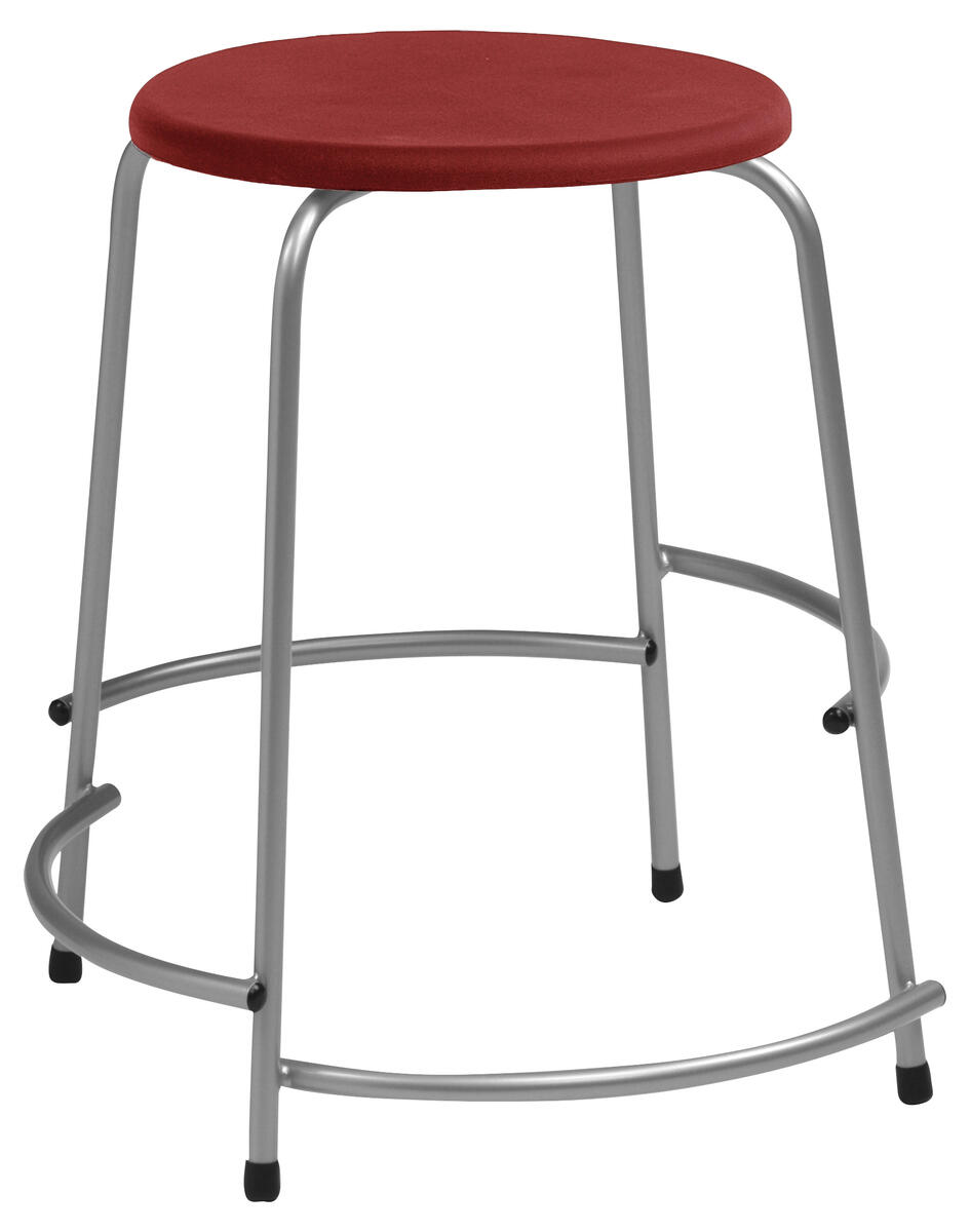 Fotstöd i 4 höjder: 7, 12, 17 och 22 cm över golvet. Stapelbar, ca 10 st på höjden. Mått: ø sits 35 cm, sitthöjd 63 cm. Sits i polyuretan. Stativ i RAL 9006.