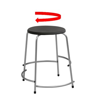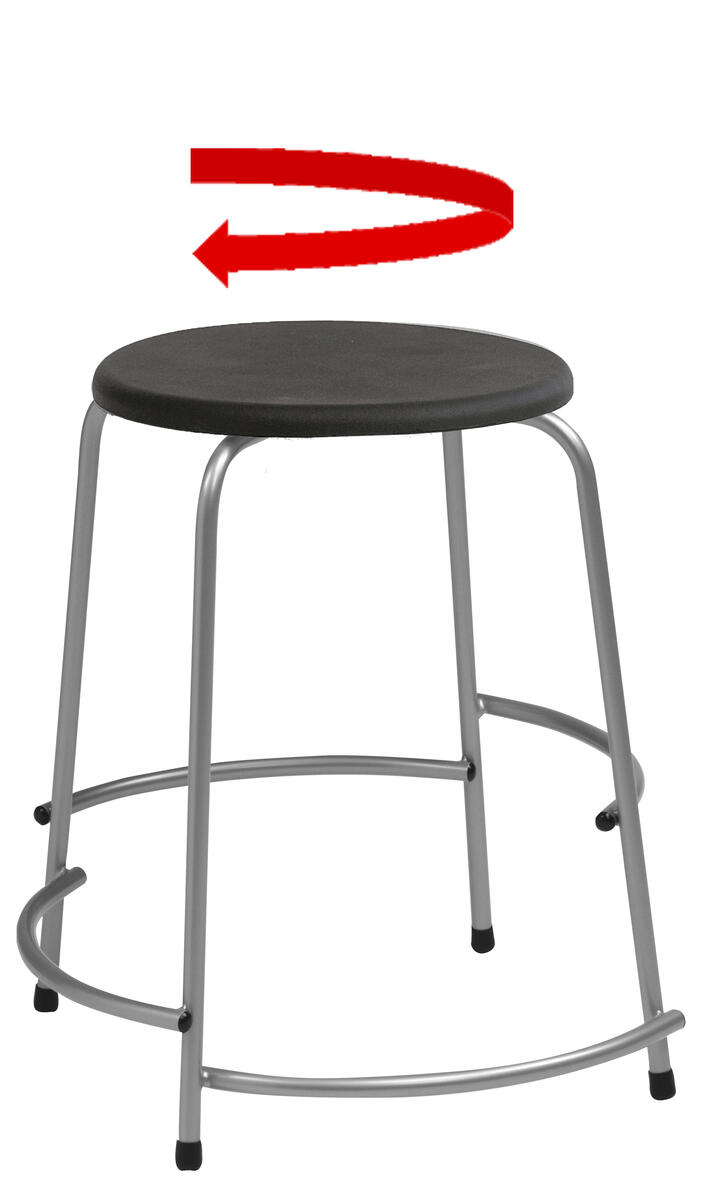 Roterande sits. Fotstöd i 4 höjder: 7, 12, 17 och 22 cm över golvet. Stapelbar, ca 10 st på höjden. Mått: ø sits 35 cm, sitthöjd 48 cm. Sits i polyuretan. Stativ i RAL 9006.
