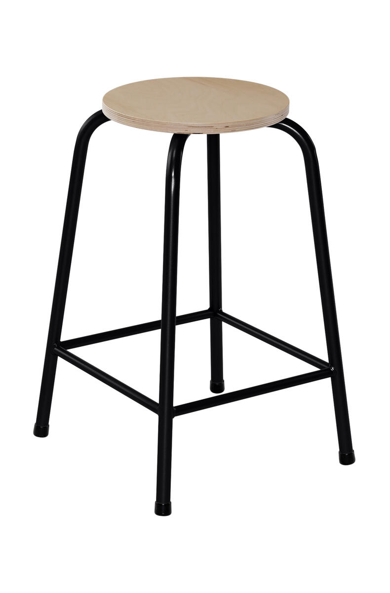 Stapelbar. Sitsdiameter 29 cm och tjocklek 1,7 cm. Svart stativ. Sits i björkkryssfaner.