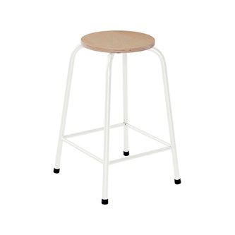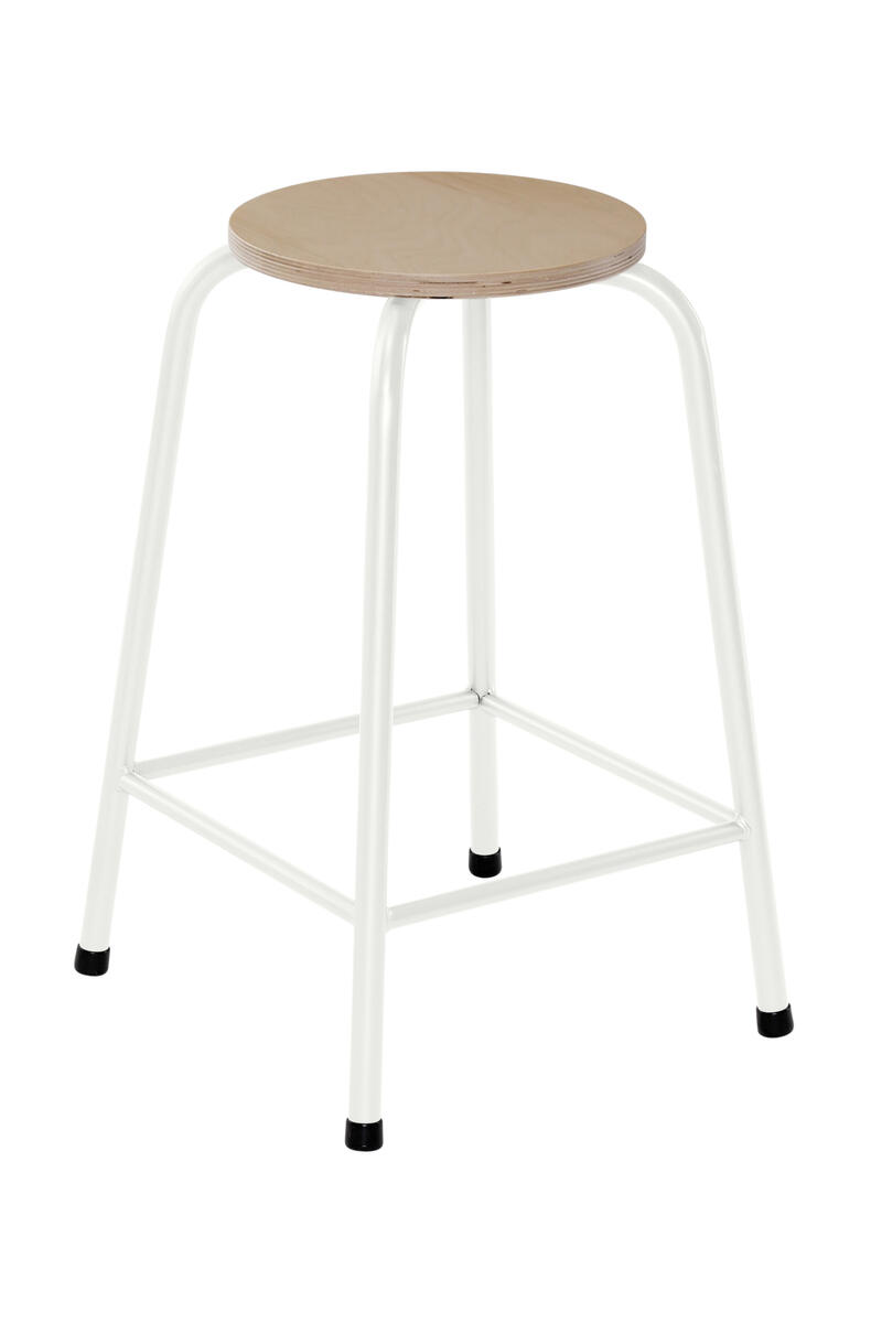 Stapelbar. Sitsdiameter 29 cm och tjocklek 1,7 cm. Vitt stativ. Sits i björkkryssfaner.