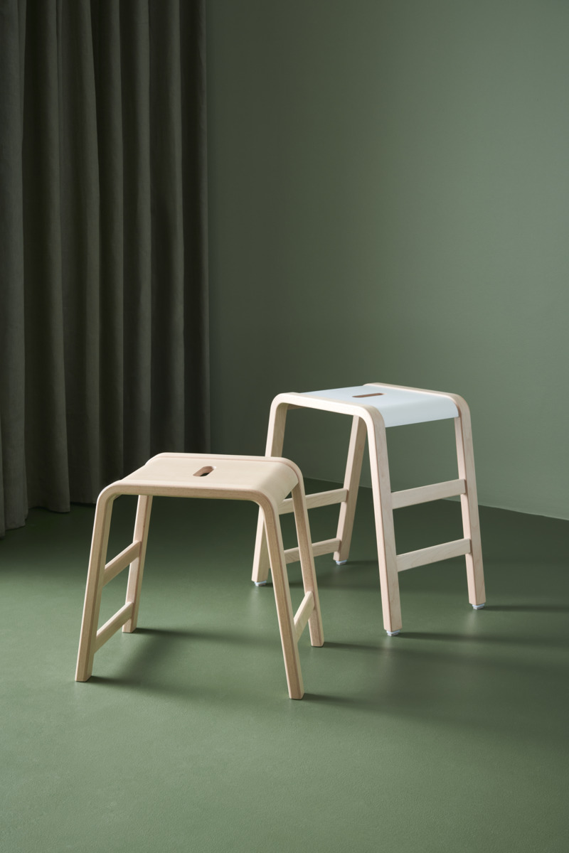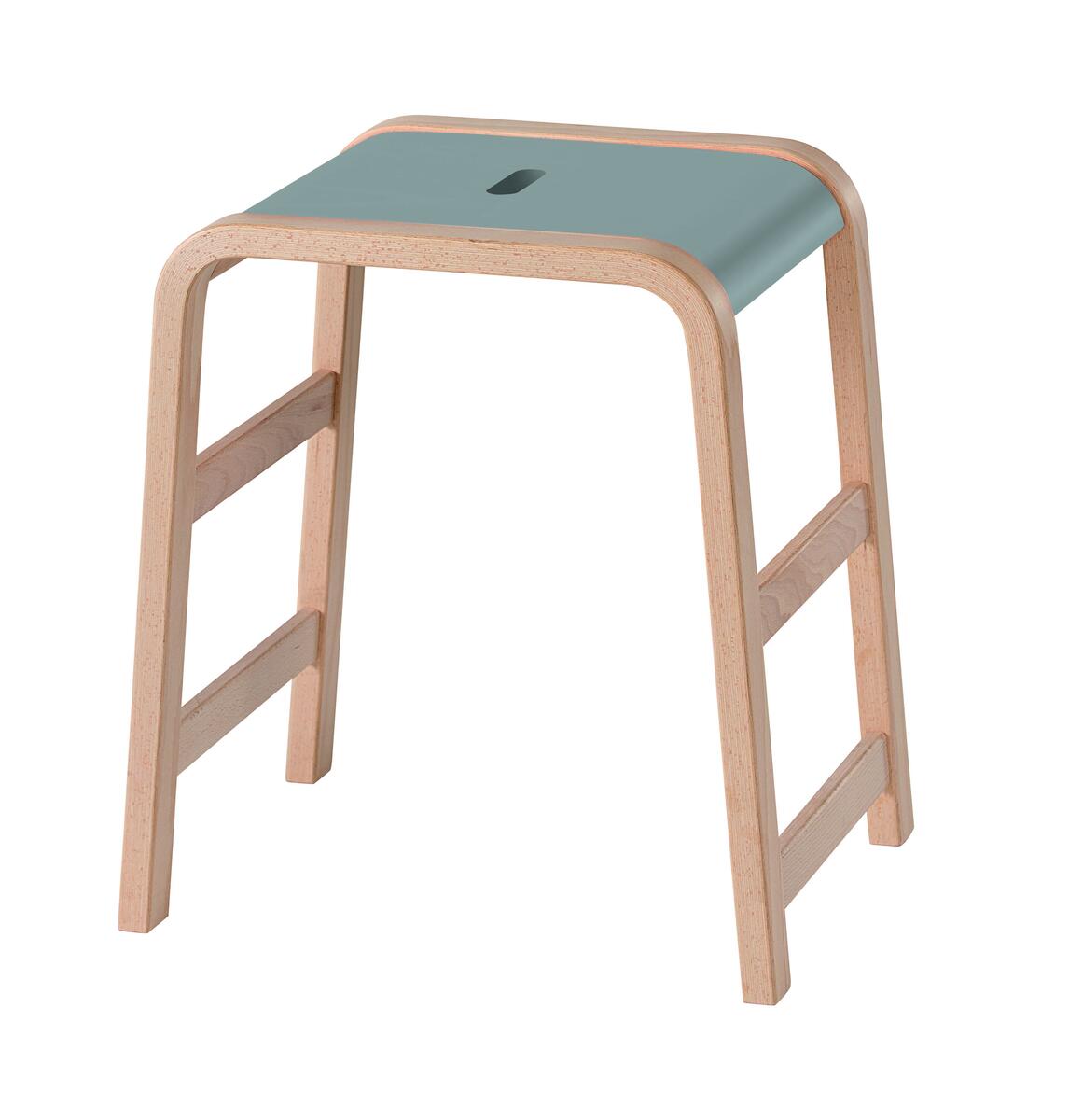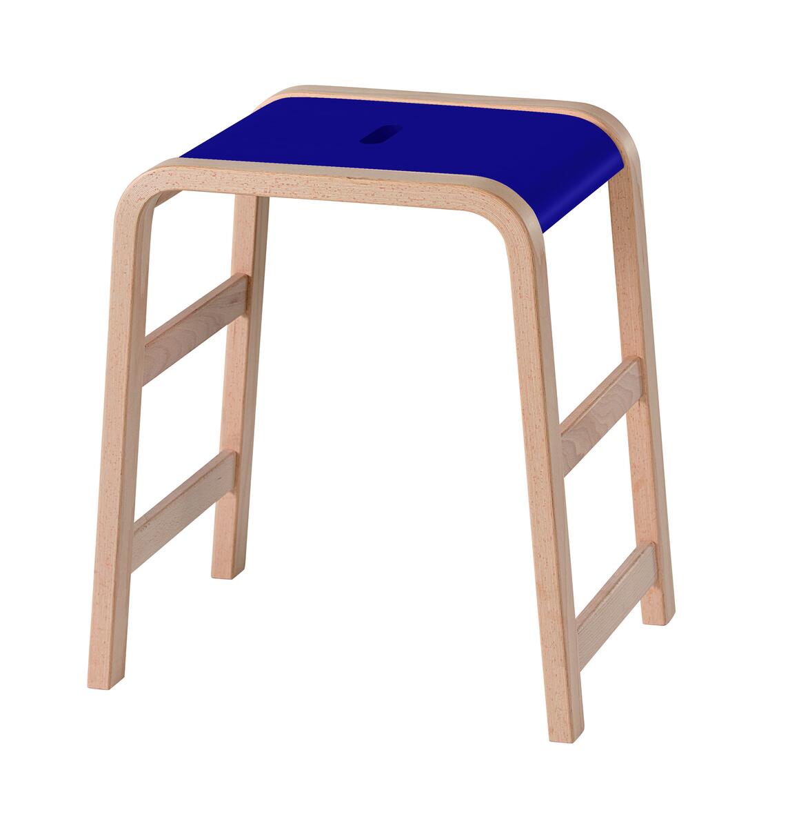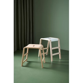 Med 3 fotstöd i olika höjder. Stapelbar (max 4). Mått bas: B35xD49 cm. Mått sits: B27x37 cm. Sitthöjd 43 cm. Vikt 3,5 kg. Pall i formpressad björk. Tjocklek ben B4xD2,5 cm. Sits i högtryckslaminat.