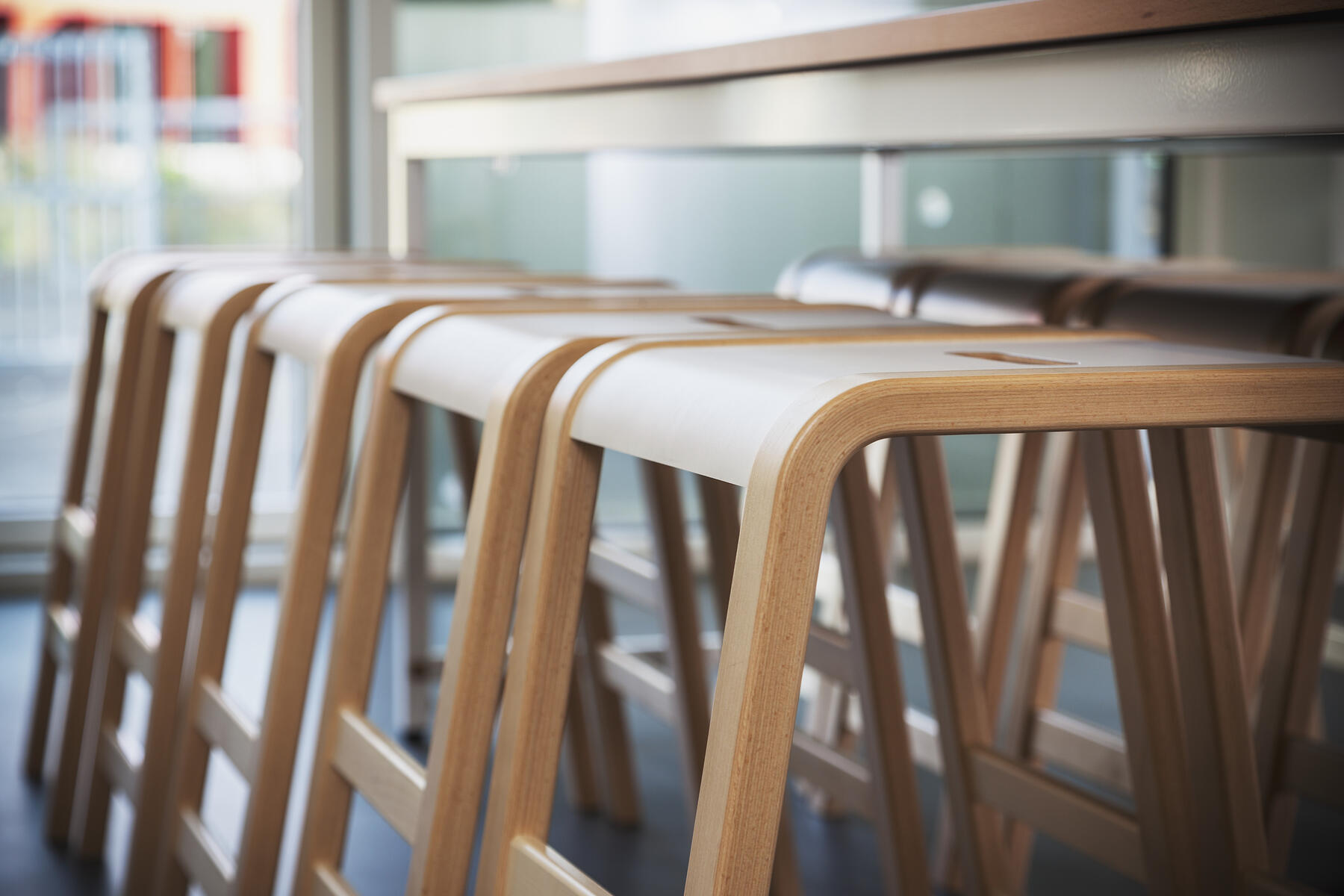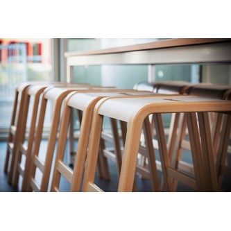 Med 4 fotstöd i olika höjder. Stapelbar (max 4). Mått bas: B35xD51 cm. Mått sits: B27x37 cm. Sitthöjd 53 cm. Vikt 4 kg. Pall i formpressad björk. Tjocklek ben B4xD2,5 cm. Sits i högtryckslaminat.