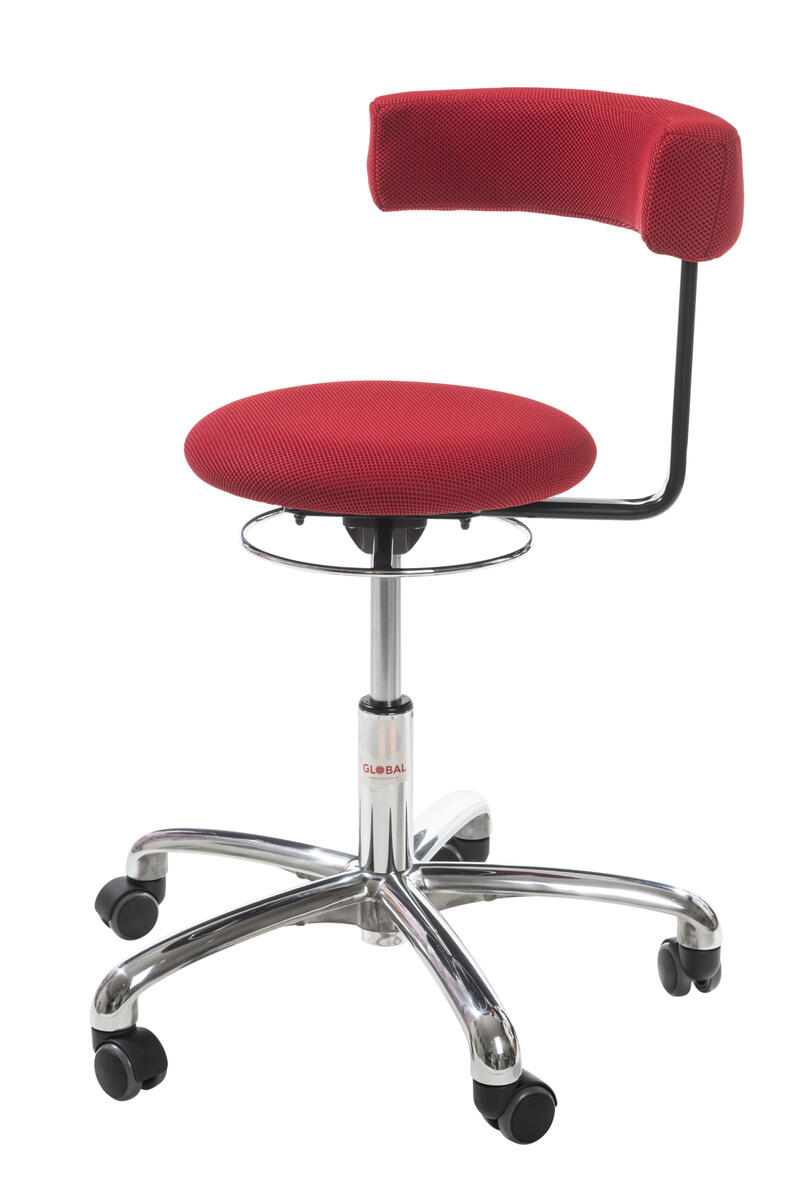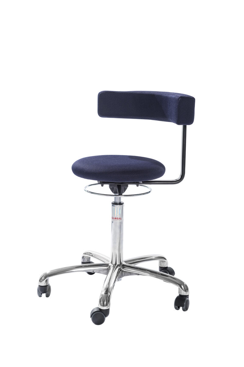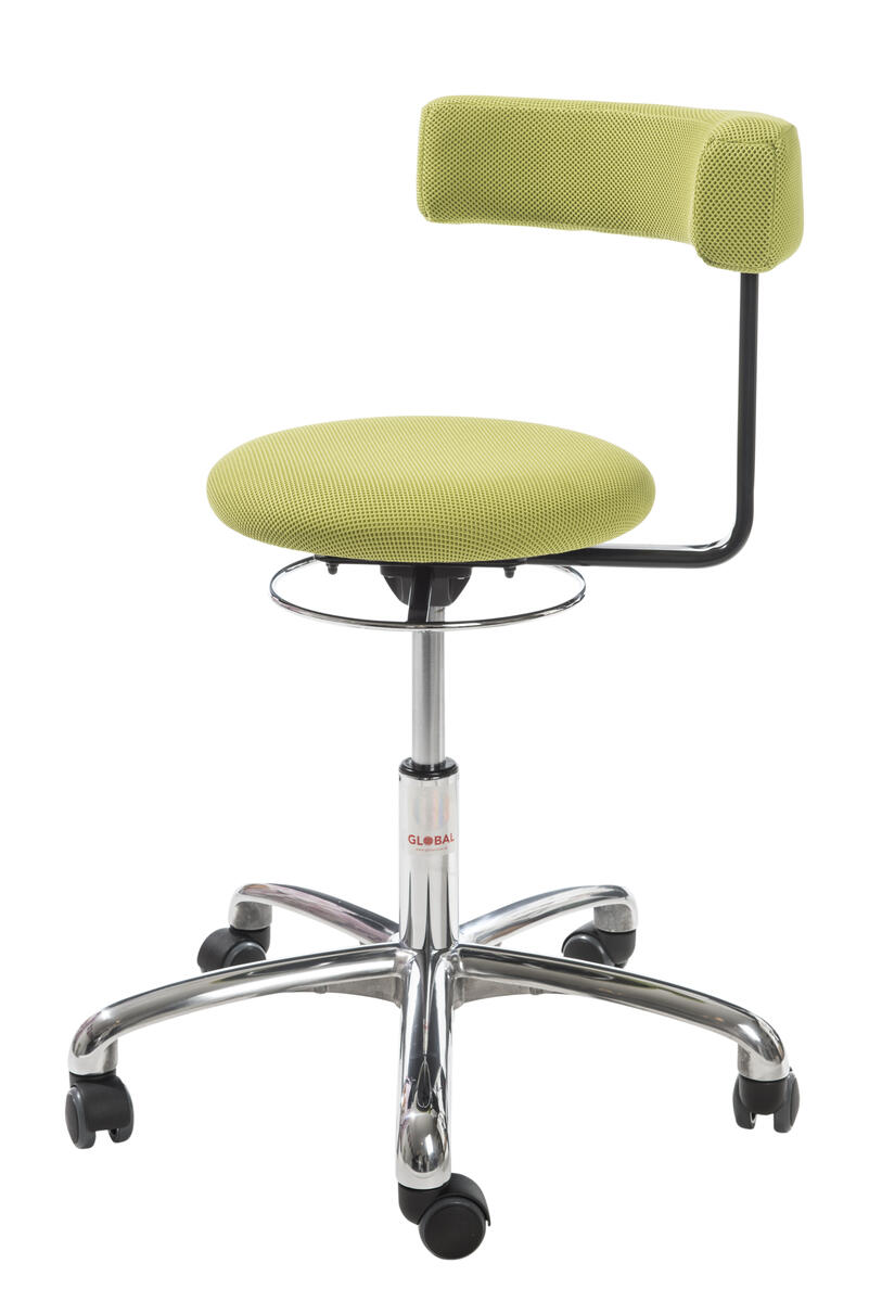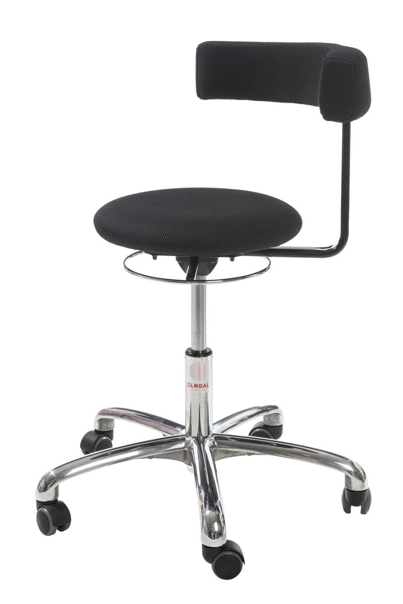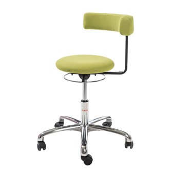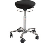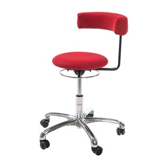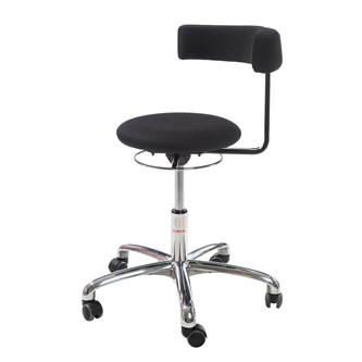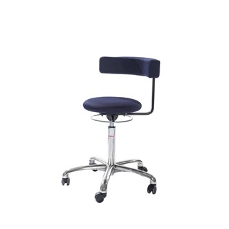Klädd sits med konstläder och stoppning med kallskum. Ett mjukt stoppat 360° roterande rygg- och armstöd. Sitthöjd 49-68 cm, justerbar med ring. ø sits 33 cm. Aluminiumkryss.