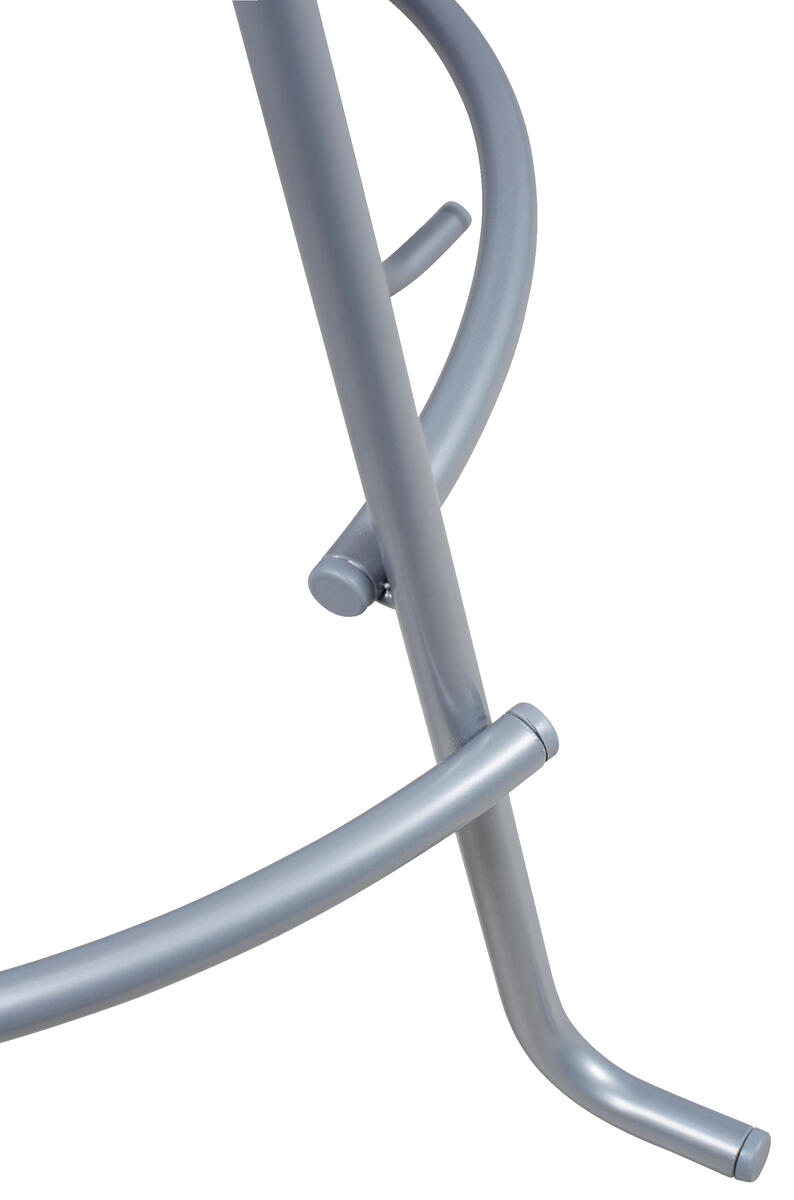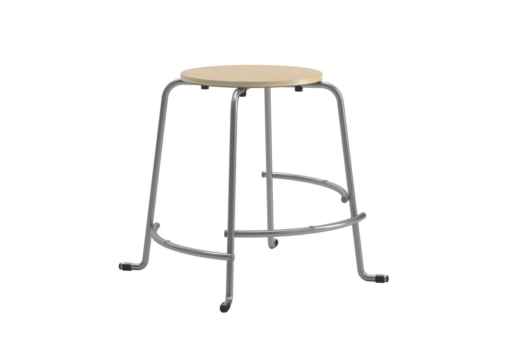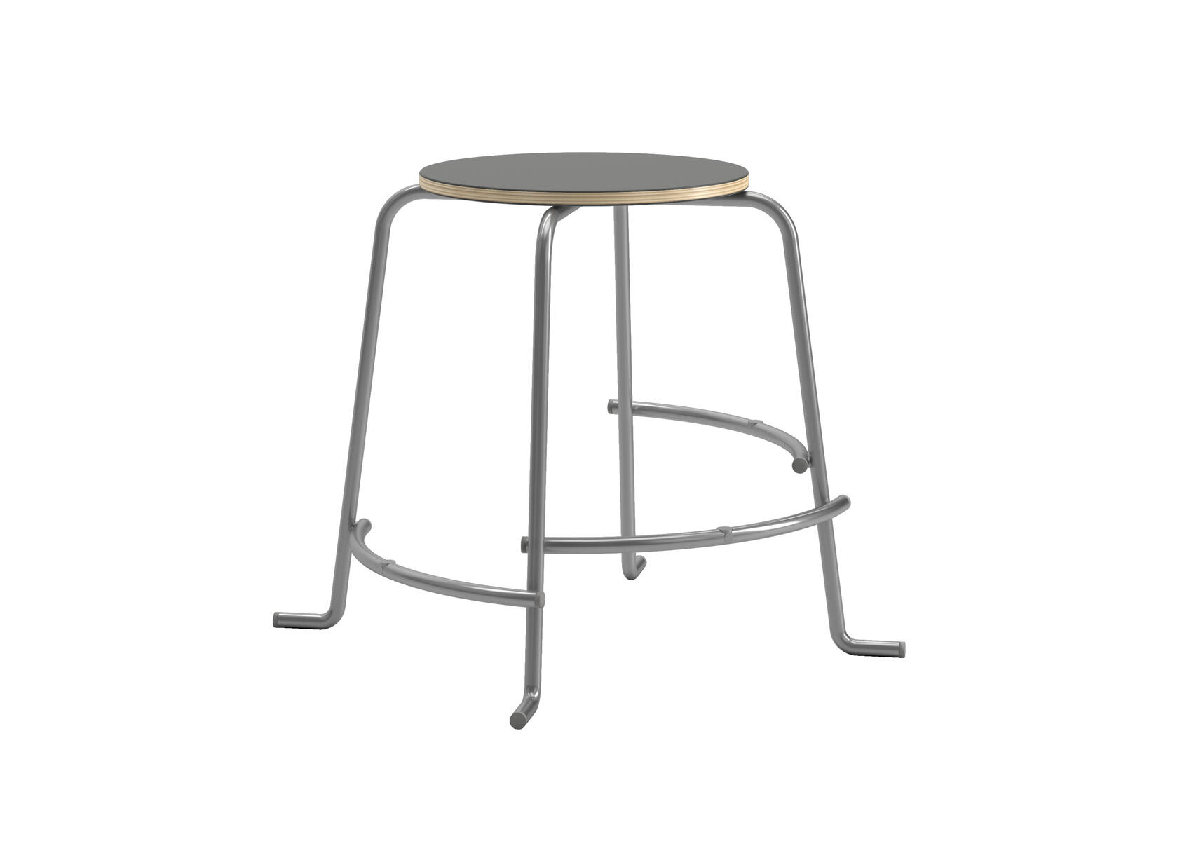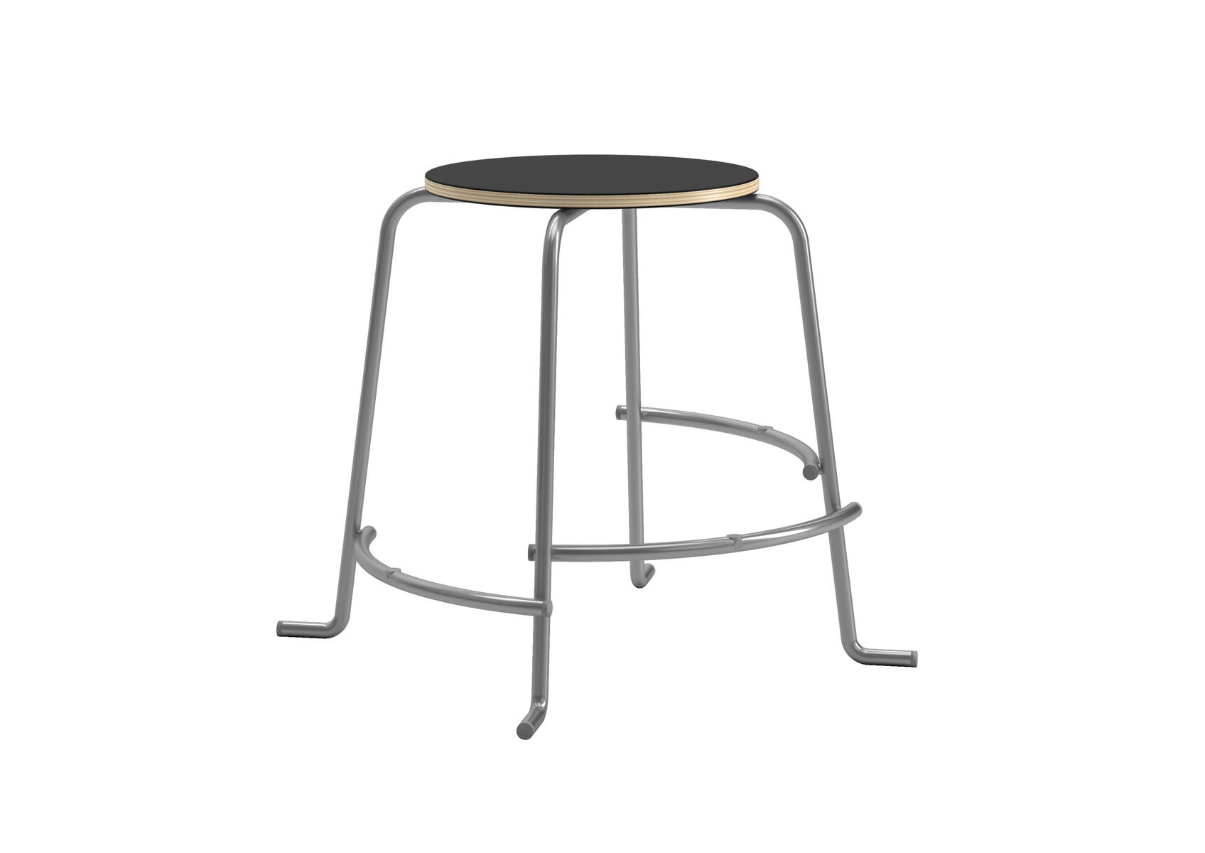 Fotstöd i 3 olika höjder. Från golv till första fotstödet: 13 cm. Mellan de andra fotstöden: 3,5 cm. Stapelbar. Tysta tassar. Mått: Sitthöjd 50 cm. Sitsdiameter 35 cm. Tjocklek 1,2 cm. Vikt 4 kg. Sits i högtryckslaminat. Silverlackerat stativ, RAL 9006.