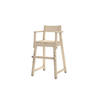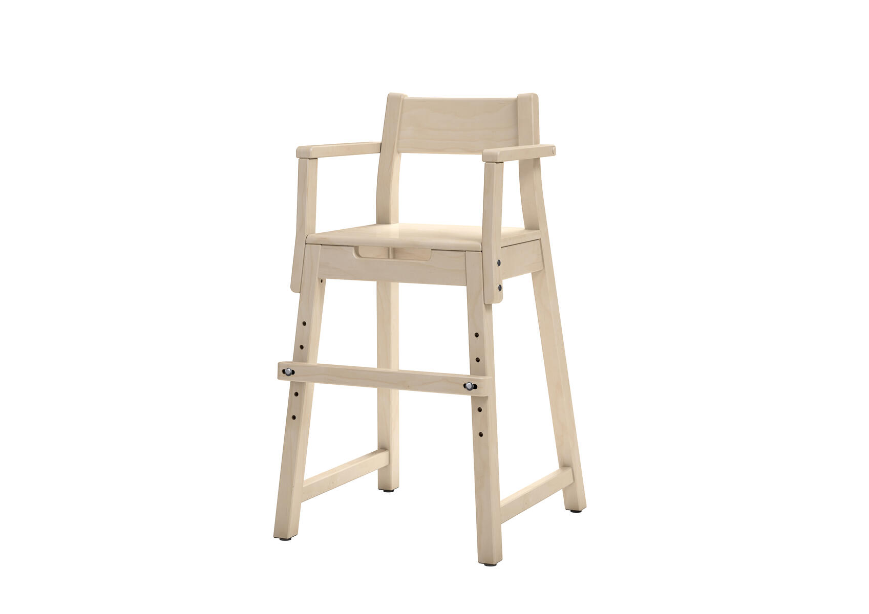 Färdigmonterad barnstol i massiv björk. Reglerbart fotstöd. Sitthöjd 53 cm. Sitsmått: B26xD21 cm. Höjd upp till bygelns överkant är 61 cm. Totalhöjd 80 cm. Vikt 5 kg. Stolen samt tillbehör är testad och godkänd enligt lagstadgad säkerhetsstandard för högstolar, EN 14988. Detta EU-krav fokuserar på stabilitet, tipprisk och hålrum. Produkten är avsedd för barn upp till 3 års ålder eller till en vikt av max 15 kg och som kan sitta själva.