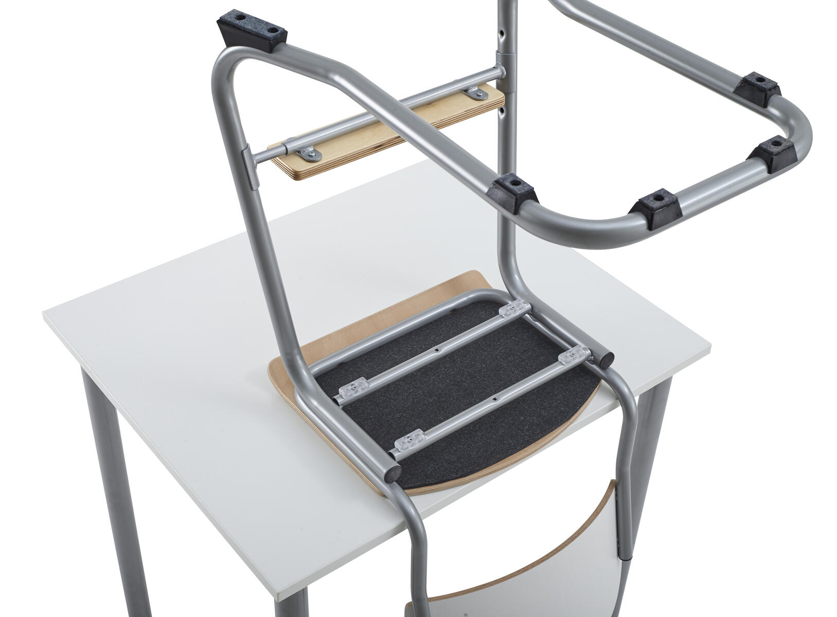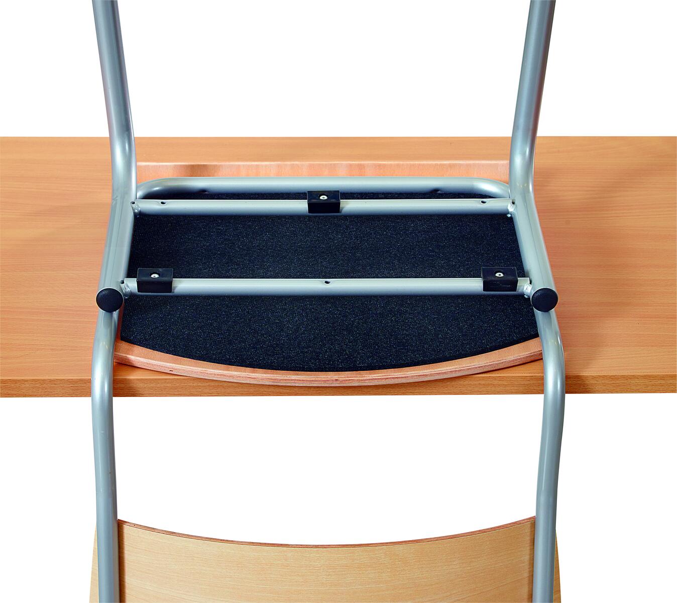 Stapelbar (max 4 st/stapel). Ljuddämpande tassar. Upphängningsbar på bord. Reglerbar fotbräda i 3 fasta lägen. Sitthöjd 50 cm. Sitsmått: B36xD35 cm. Totaldjupet på stativet är 54 cm. Vikt 4,6 kg. Sits och rygg i högtryckslaminat. Silverlackerat stativ, RAL 9006.