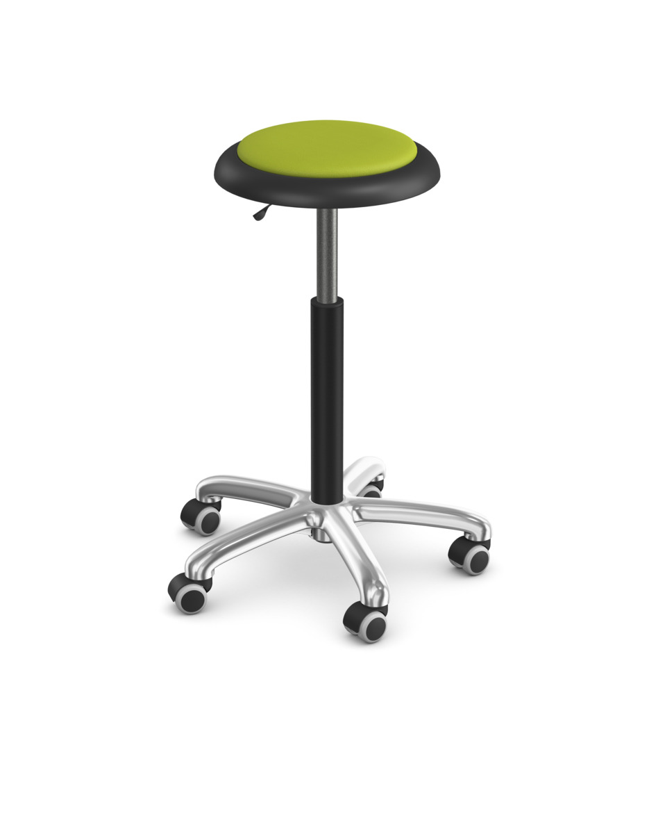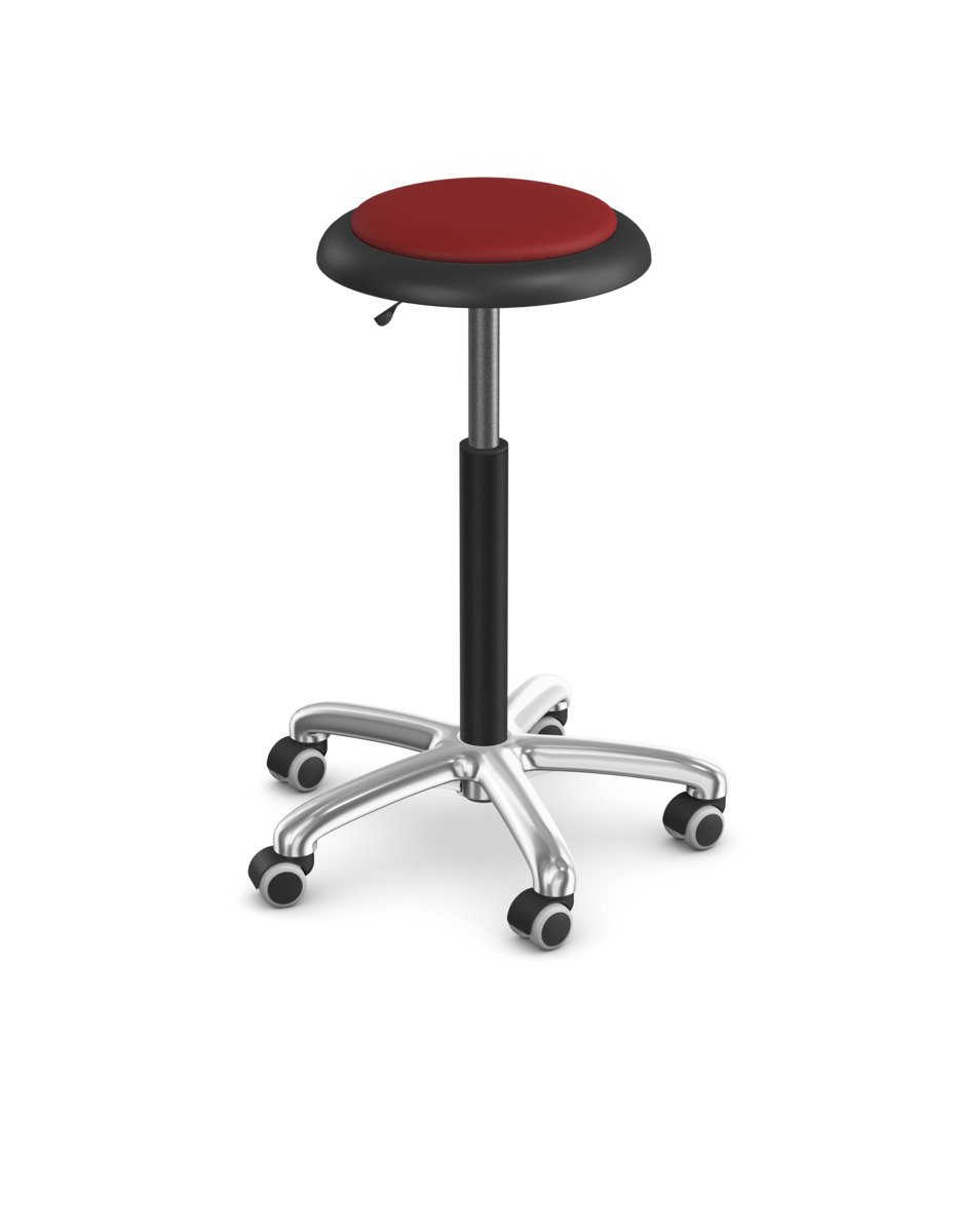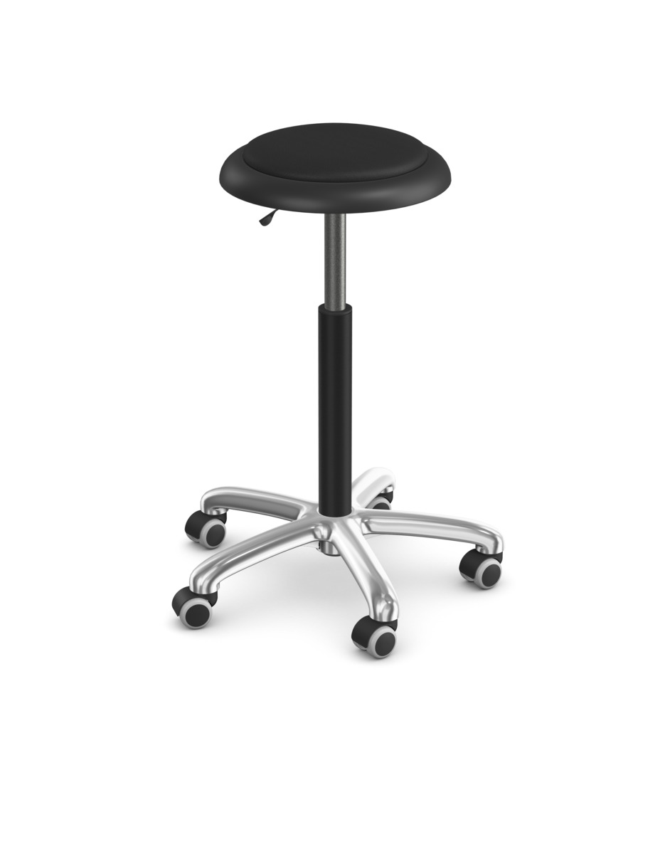 Bekväm och ergonomisk sadelstol, inklusive ryggstöd. Ställbar sitthöjd 35–44 cm. Totaldiameter på sits 32 cm. Totaldiameter på fotkryss 55 cm. Sits i konstläder med stoppning.