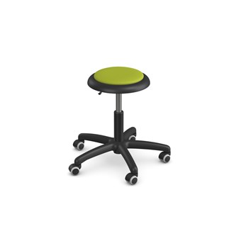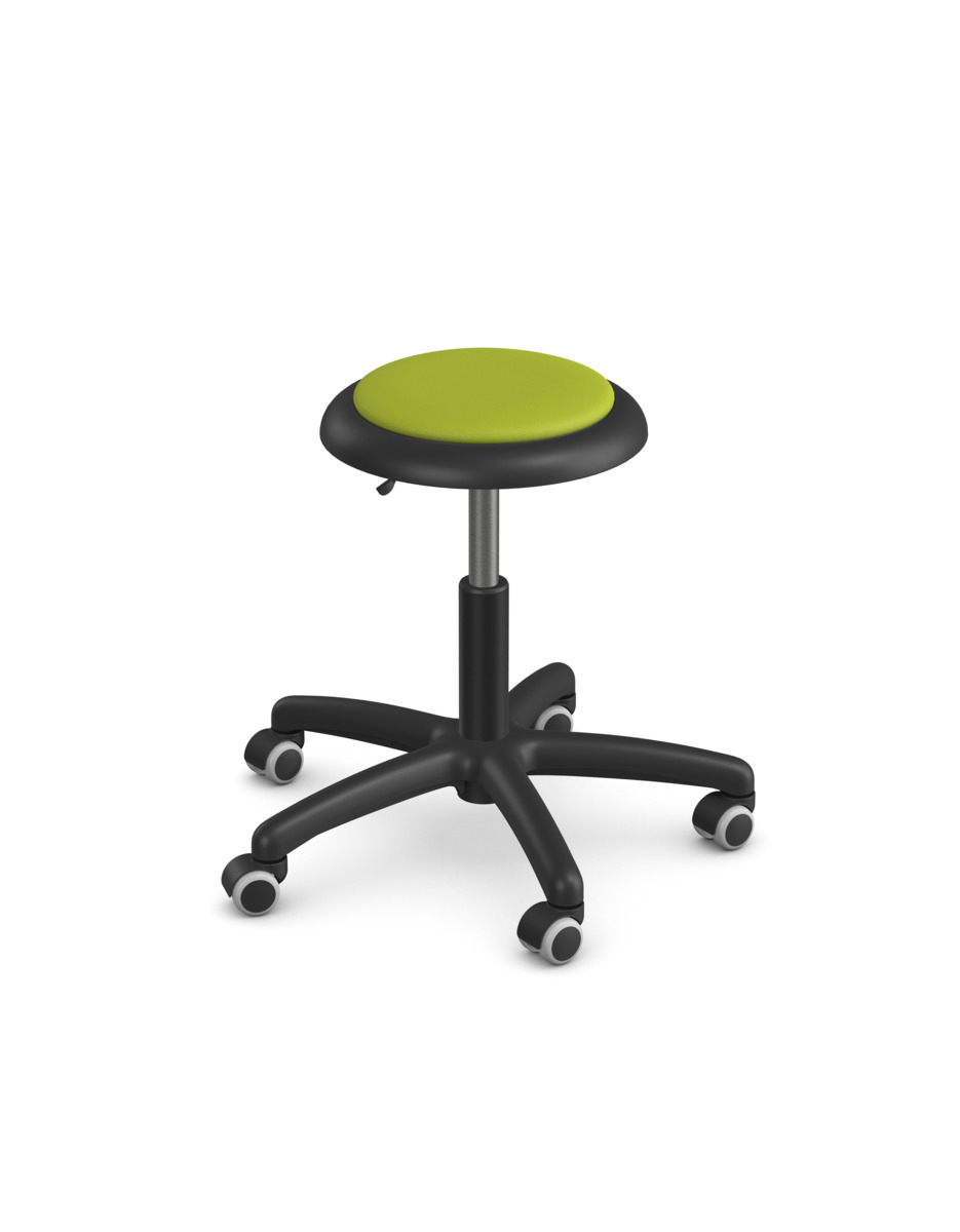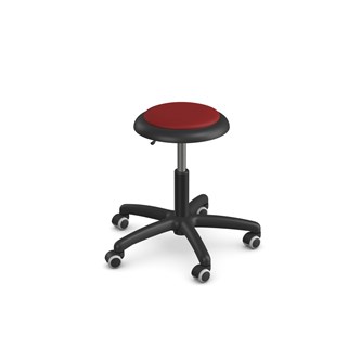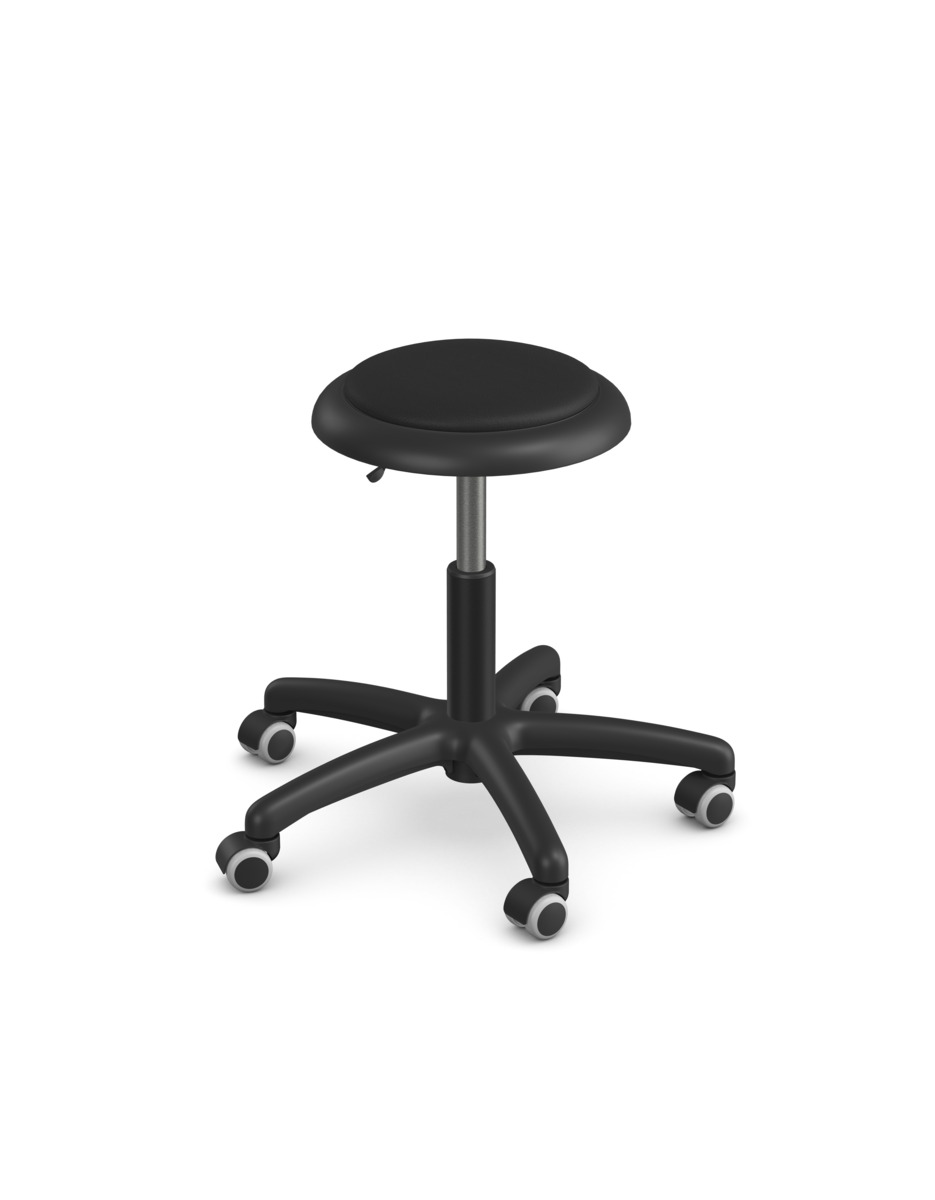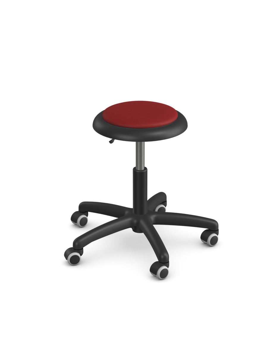 Bekväm och ergonomisk sadelstol, inklusive ryggstöd. Ställbar sitthöjd 35–44 cm. Totaldiameter på sits 32 cm. Totaldiameter på fotkryss 55 cm. Sits i konstläder med stoppning.