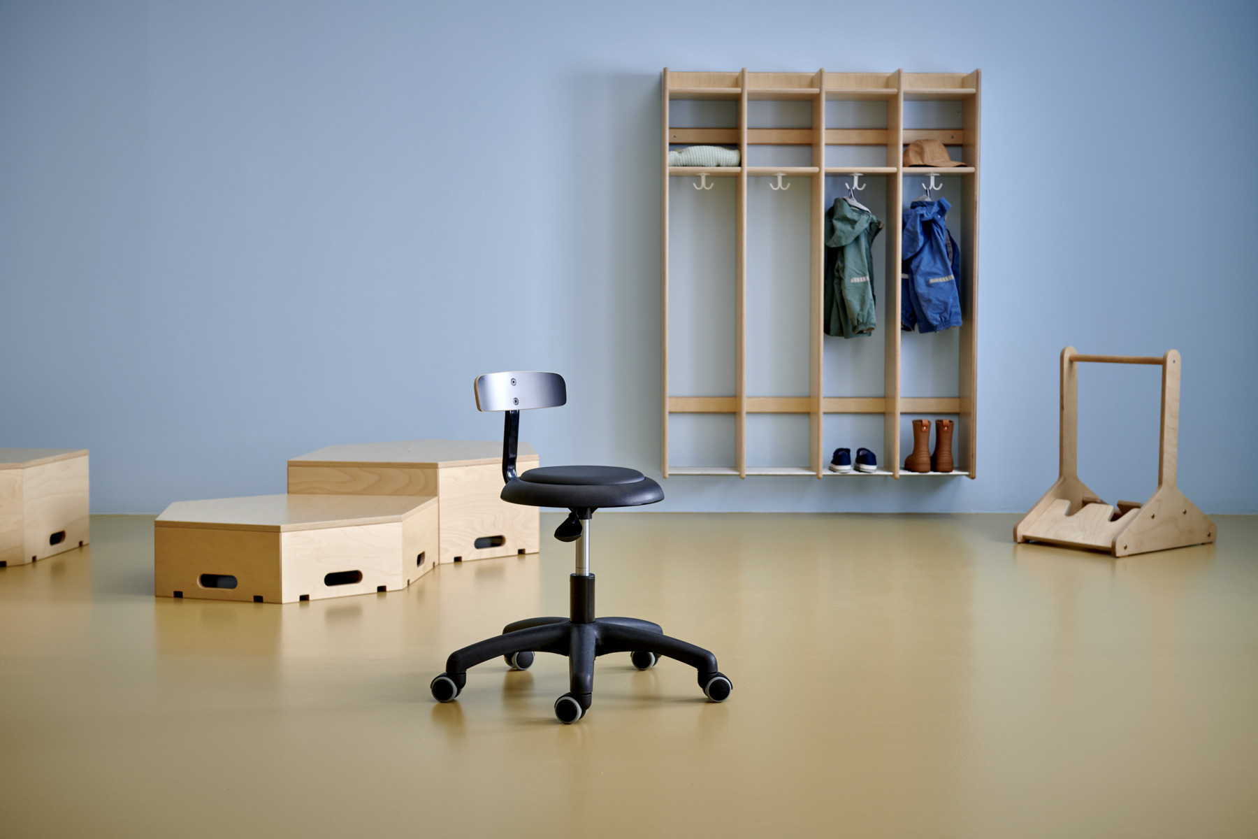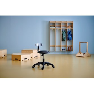 En bekväm stol som går att justera i de lägre sitthöjderna när pedagogen hjälper barnen på förskolan. Klädd med konstläder som är enkelt att rengöra. Plastkrysset är 60 cm med lättrullande hjul. Sitsen går att vinkla 6 grader framåt och 2 grader bakåt. Ryggen kan vinklas 12 grader framåt och 11 grader bakåt. Ryggmått 37x33 cm.