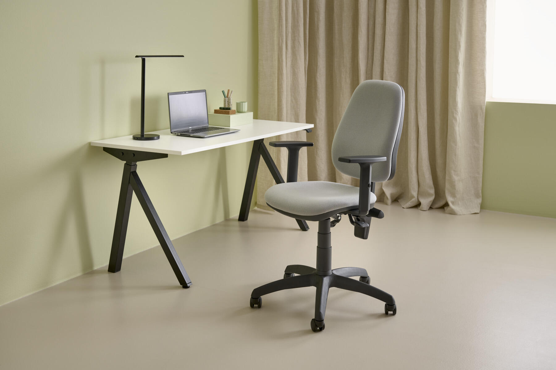 Synkronmekanism, låsbar i 5 olika lägen. Höj- och sänkbar, 44–57 cm. Ryggen ställbar i höjd. Sitsdjup ställbart 44–50 cm. Inkl. höjdjusterbara armstöd.