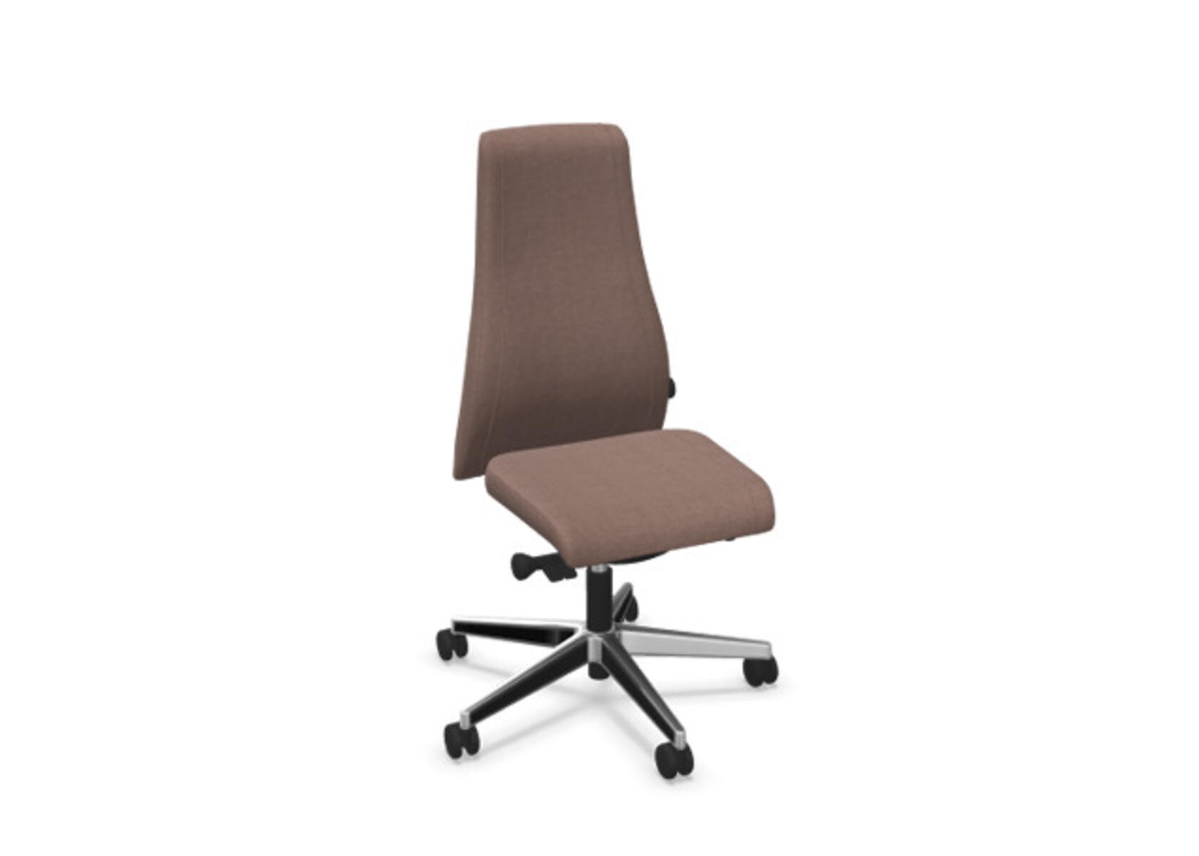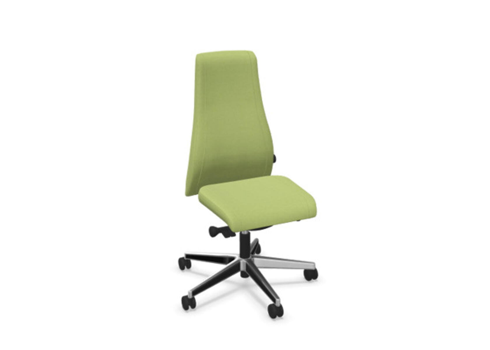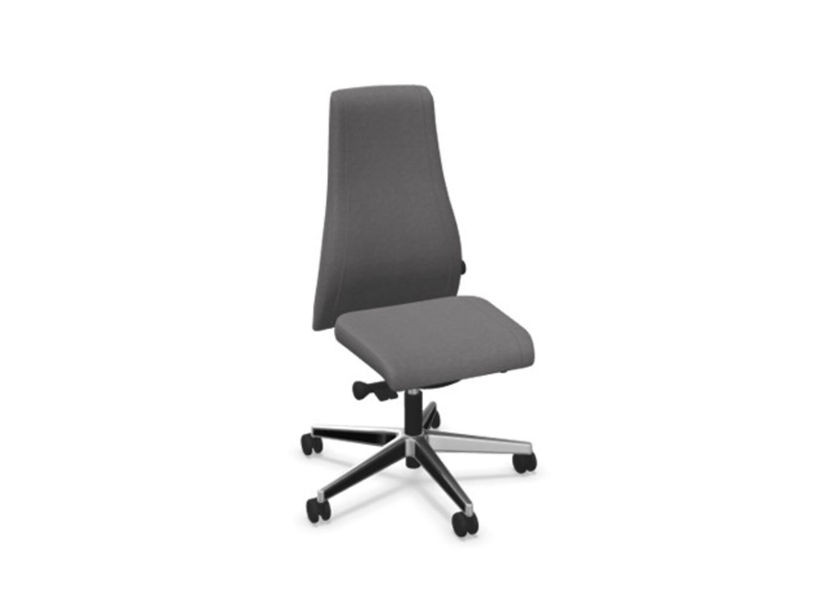 En stilren och ergonomisk kontorsstol med helklädd hög rygg och synkronmekanism, utformad för att ge stöd vid aktivt sittande under hela arbetsdagen. Klädd i polyestertyg. Den synkroniserade lutningen av ryggstöd och sits möjliggör aktiv och bekväm sittställning. Ryggstödslutningsvinkel 20° synkroniserad med sitslutningsvinkel 11°. Ryggstödet är låsbart i 5 olika lägen för individuell anpassning och du kan enkelt justera ryggstödets motstånd med ett vred. Ryggstödet är höjdjusterbart inom intervallet 70 mm med 13 låslägen. Justerbart, klätt nackstöd med vinkel-och höjdjustering inom intervallet 75 mm. Stolen har även Anti-Shock funktion vilket förhindrar ryggstödet slår tillbaka när lutningen låses upp. Välj mellan kryss i svart polyamid eller polerad alu samt självbromsande hjul för mjuka eller hårda golv. Som tillval finns även ländryggstöd, manuellt justerbart i djupled (20 mm) med hjälp av ett vred. Armstöd 2D, 3D alternativt 4D säljs separat.
