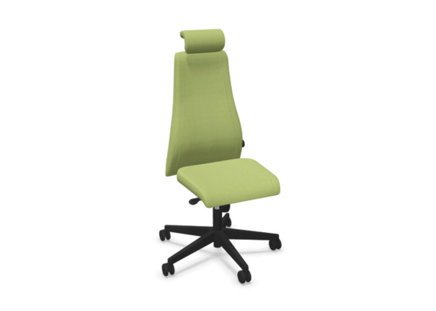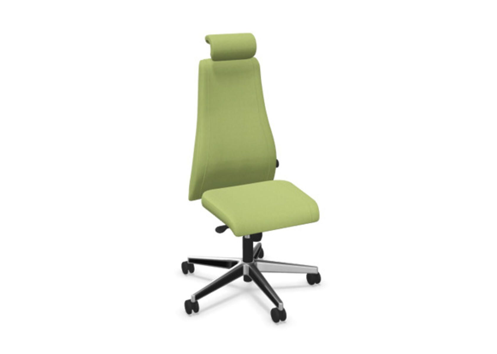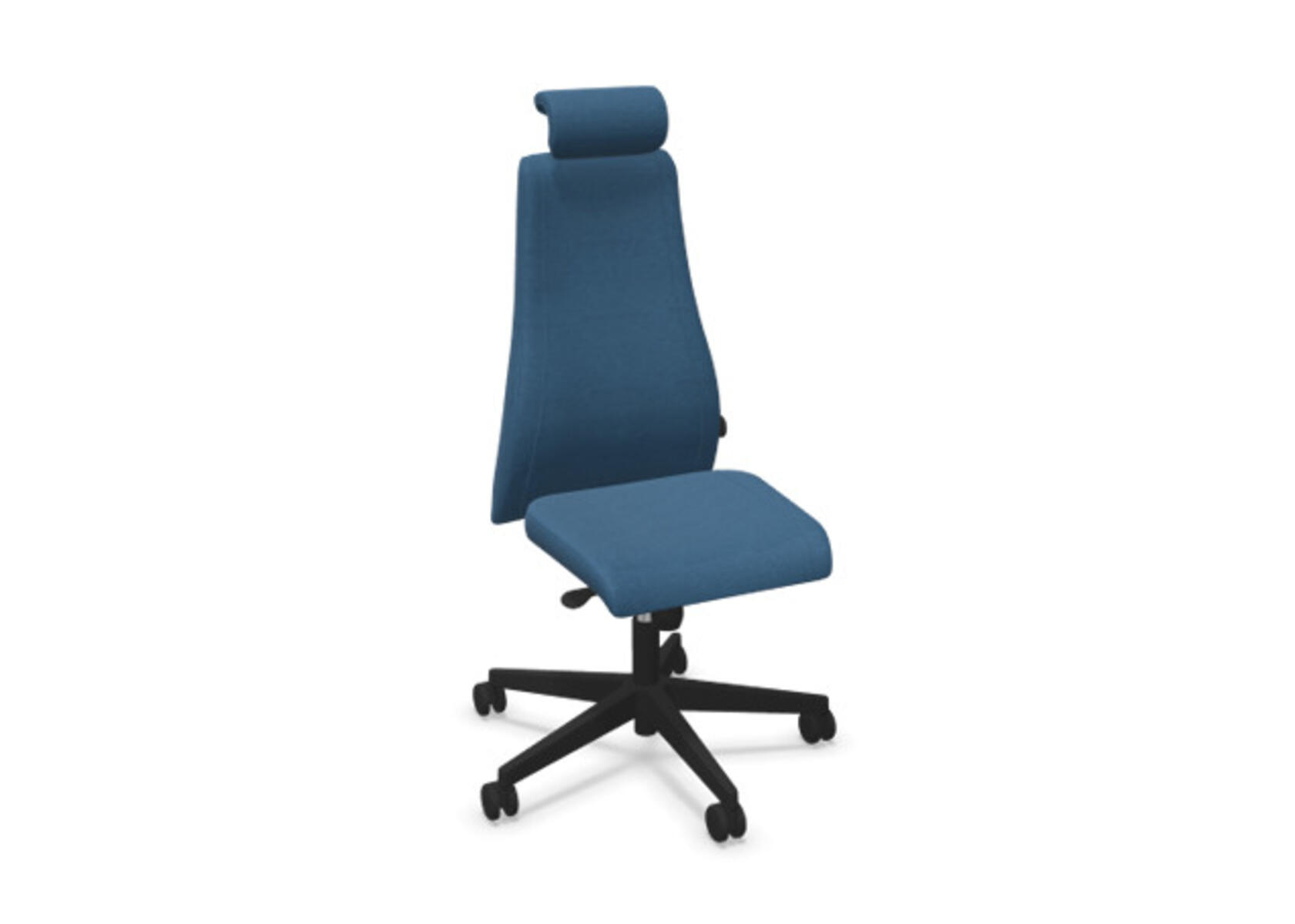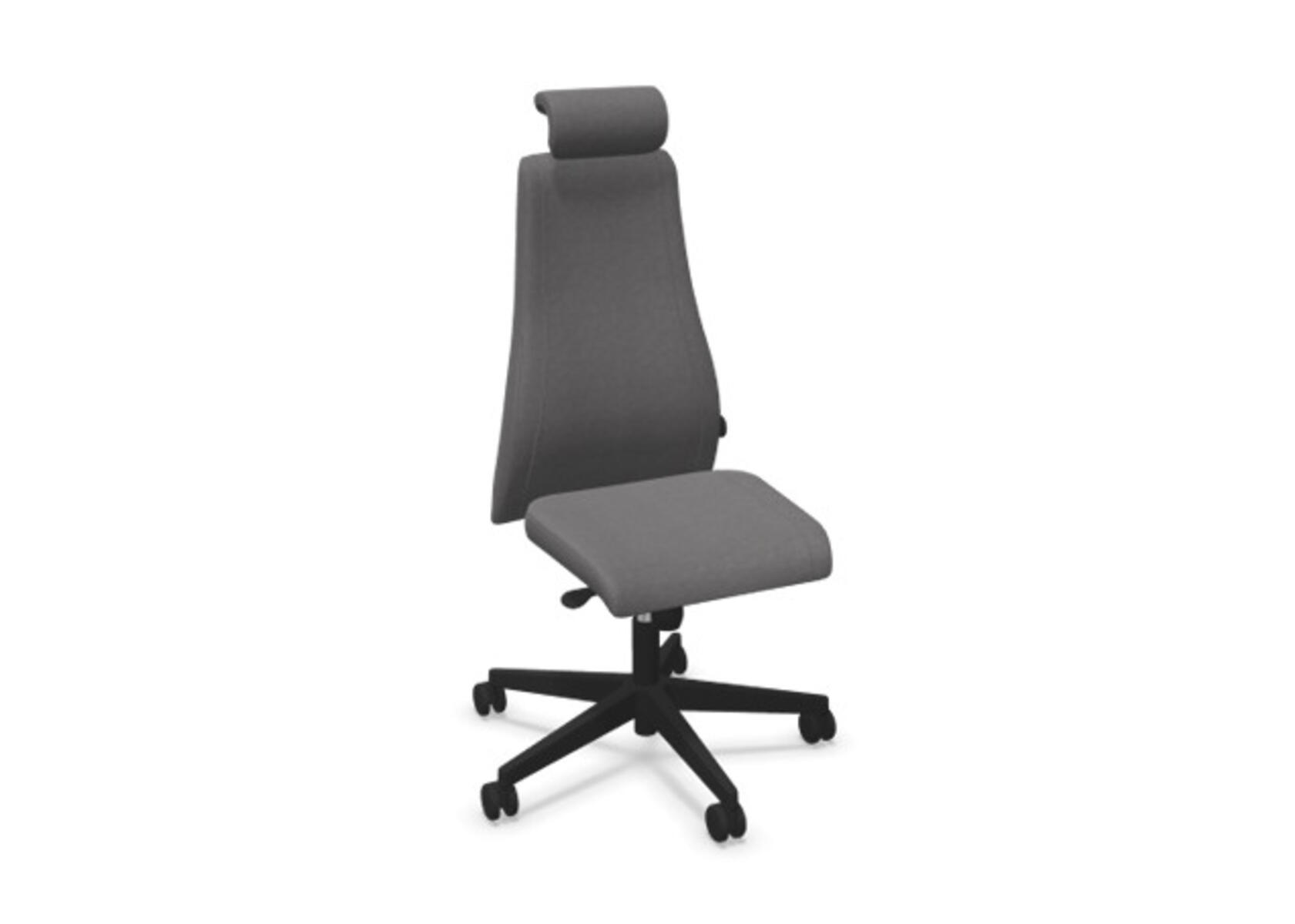 En stilren och ergonomisk kontorsstol med helklädd hög rygg och synkronmekanism, utformad för att ge stöd vid aktivt sittande under hela arbetsdagen. Klädd i polyestertyg. Den synkroniserade lutningen av ryggstöd och sits möjliggör aktiv och bekväm sittställning. Ryggstödslutningsvinkel 20° synkroniserad med sitslutningsvinkel 11°. Ryggstödet är låsbart i 5 olika lägen för individuell anpassning och du kan enkelt justera ryggstödets motstånd med ett vred. Ryggstödet är höjdjusterbart inom intervallet 70 mm med 13 låslägen. Justerbart, klätt nackstöd med vinkel-och höjdjustering inom intervallet 75 mm. Stolen har även Anti-Shock funktion vilket förhindrar ryggstödet slår tillbaka när lutningen låses upp. Välj mellan kryss i svart polyamid eller polerad alu samt självbromsande hjul för mjuka eller hårda golv. Som tillval finns även ländryggstöd, manuellt justerbart i djupled (20 mm) med hjälp av ett vred. Armstöd 2D, 3D alternativt 4D säljs separat.