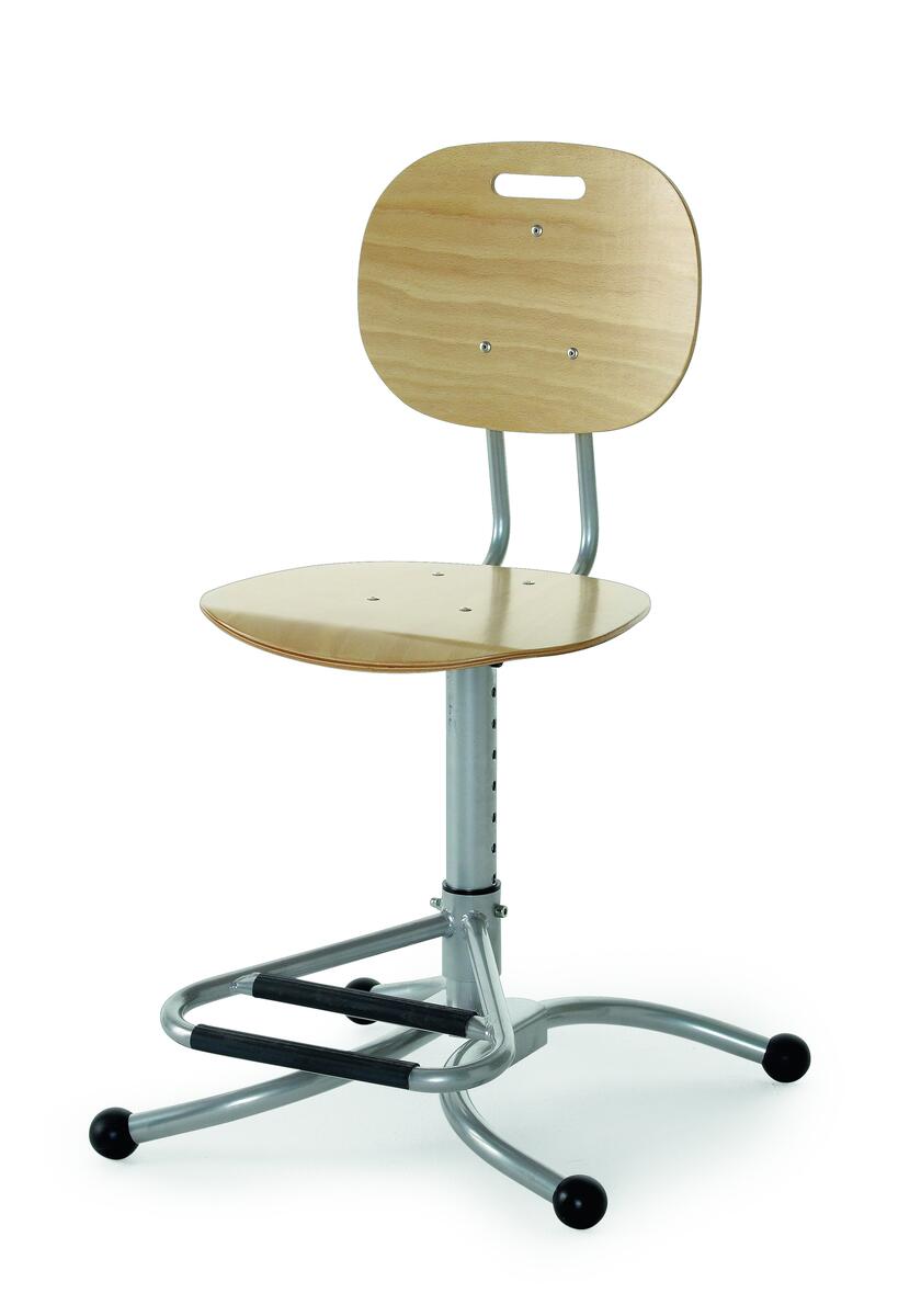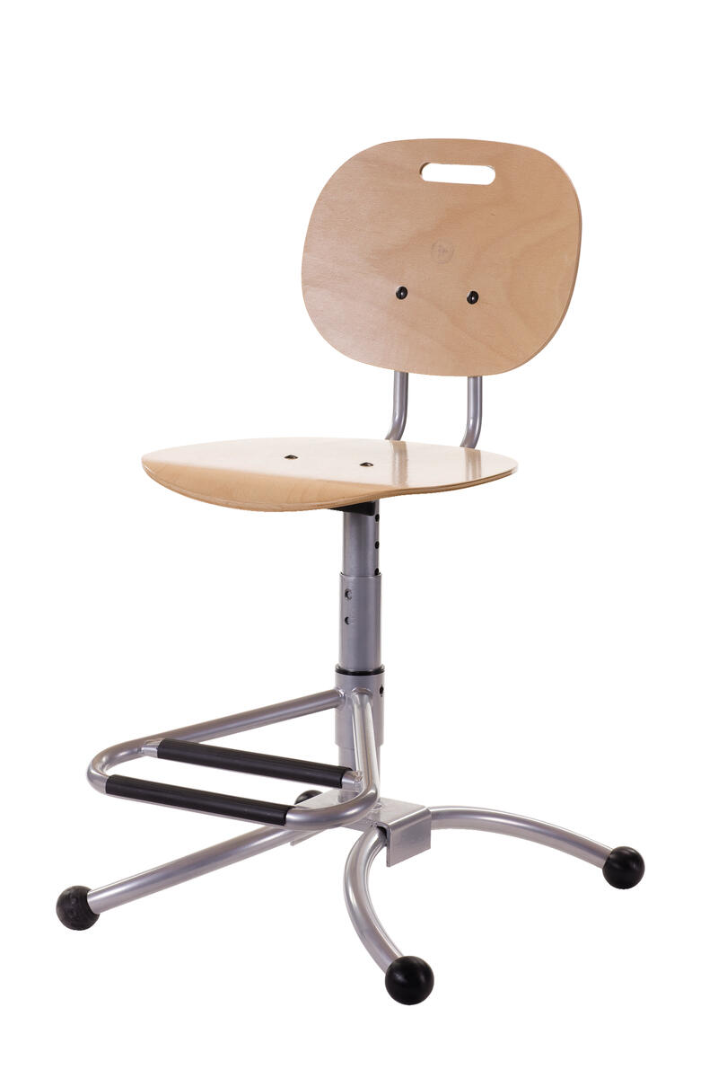 Stolen är upphängningsbar på bord. Inklusive justerbart fotstöd. Justerbar sitthöjd 45-66 cm. Sitsmått: B40xD35 cm. Vikt 7 kg. Sits och fotstöd kan ej roteras. Sits och rygg i faner. Stativ lackerat i silver, RAL 9006. Denna stol hette tidigare Truls.