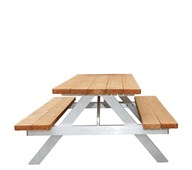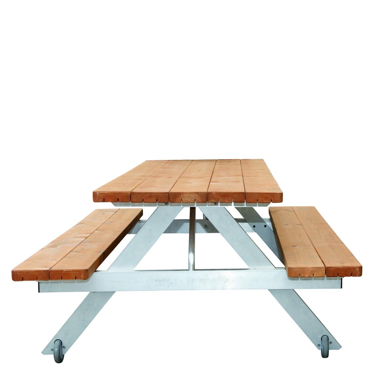 Bänkbord i trä med aluminiumunderrede, för vuxna. Flyttbart med 2 hjul. Lätt och stabil konstruktion. Hörnen är rundade och träet är oljebehandlat. Bänkplattor och bordsskiva är monterade på aluminiumprofiler. Förmonterade hjulgavlar. Monteringsanvisning, skruvar (i rostfritt stål) och verktygsnycklar medföljer. Mått: 180x130 cm. Höjd: bordsskiva 72 cm och bänk 43 cm. Bredd: bordsskiva 70 cm, bänk 31 cm.