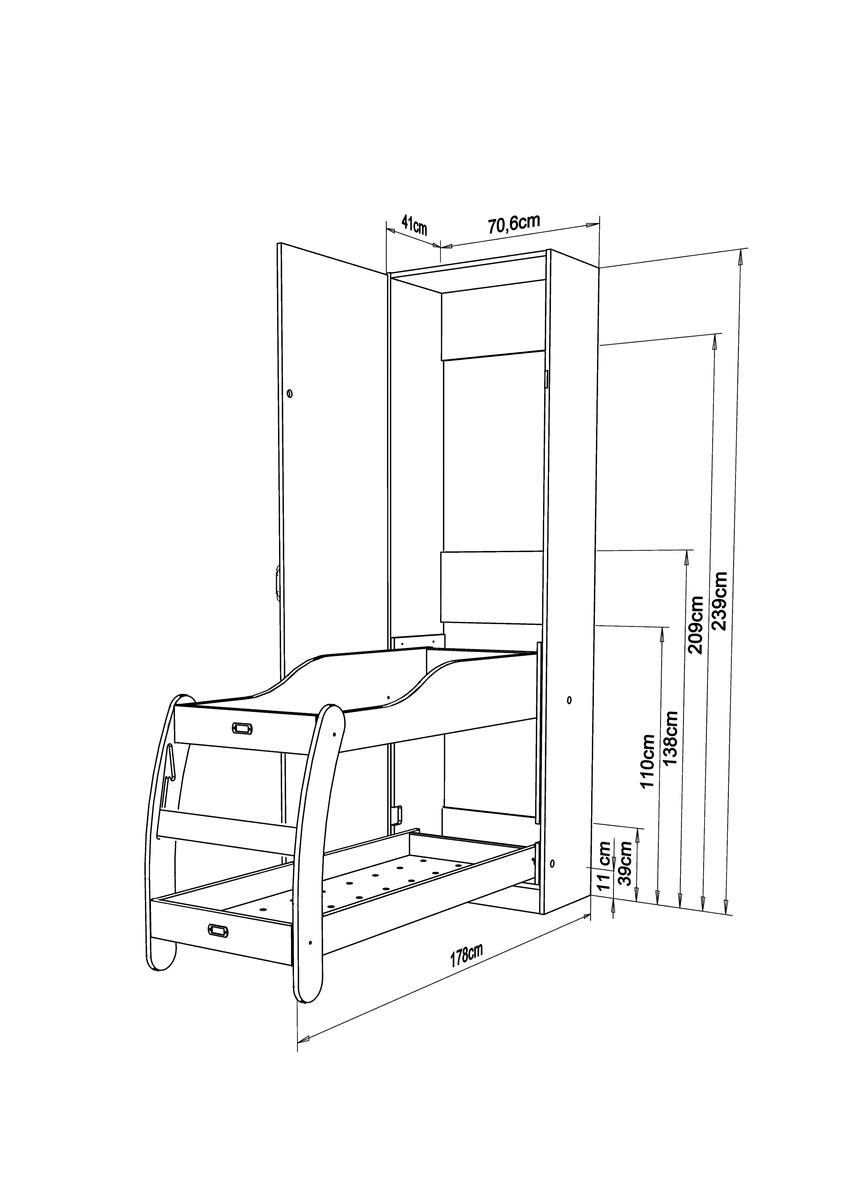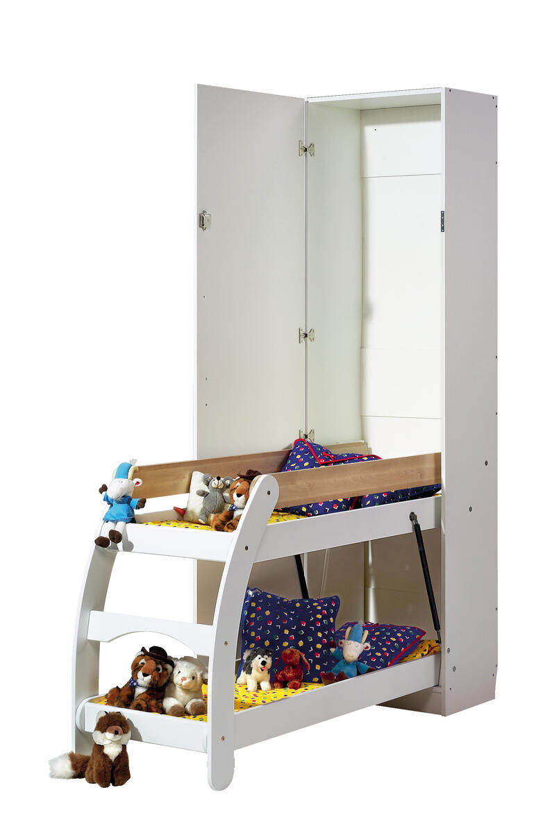 Sängskåp med två sängar som du lätt får fram när det är dags för vila. När barnen har vilat klart är det bara att fälla upp sängarna och stänga dörren så kan ytan användas för lek. Skåpet är försett med en högerhängd dörr som har en tryckknapp med säkerhetslåsning. Våningssängsstomme i vitmålad MDF. Övre bädd har höga fastmonterade stödbrädor av björk. Lätt att lyfta upp sängen med hjälp av gasfjädern. Bäddmått: L140xB53 cm. Skåpets mått: B71xD41xH239 cm. Skåpet är i vit melamin. Sängskåpet bör alltid fästas i väggen. Under sockeln finns små plaststift (höjd 5 mm). Levereras monterad. Vikt 100 kg.