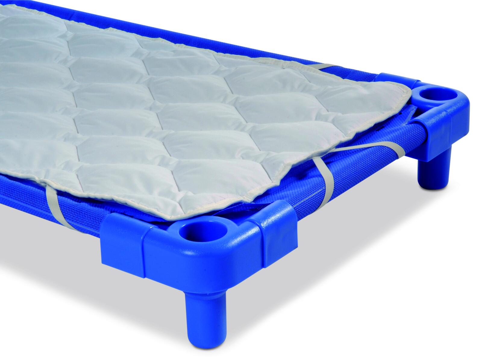 Sängen är stapelbar, lätt att flytta och har mjuka, rundade former. Sängbotten är gjord av PVC utan förbjudna ftalater och polyestertyg som andas. Botten fästes med stark kardborre och är enkel att ta av för tvätt. Madrass och madrassöverdrag köpes separat. Mått: 132x55,7x20 cm, bäddmått 130x52x20 cm. Vid stapling adderar varje säng drygt 6 cm. Lätt att rengöra och lätt att montera utan verktyg.