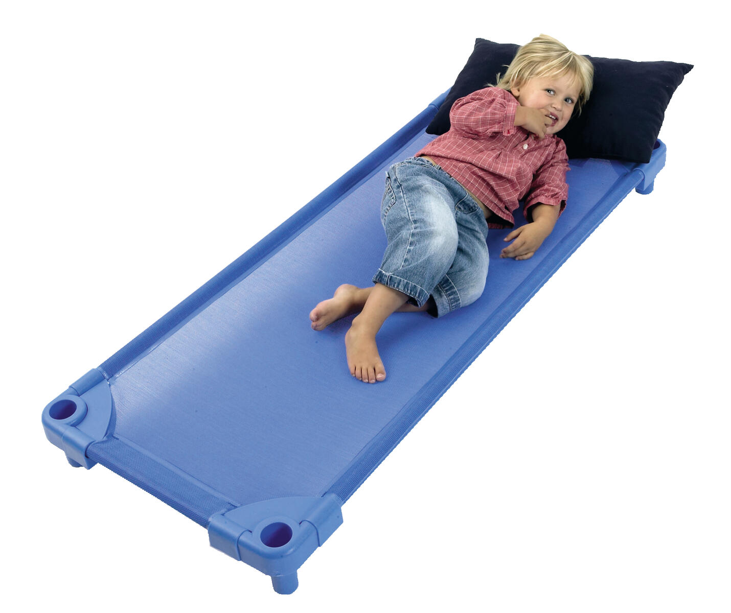 Sängen är stapelbar, lätt att flytta och har mjuka, rundade former. Sängbotten är gjord av PVC utan förbjudna ftalater och polyestertyg som andas. Botten fästes med stark kardborre och är enkel att ta av för tvätt. Madrass och madrassöverdrag köpes separat. Mått: 132x55,7x20 cm, bäddmått 130x52x20 cm. Vid stapling adderar varje säng drygt 6 cm. Lätt att rengöra och lätt att montera utan verktyg.
