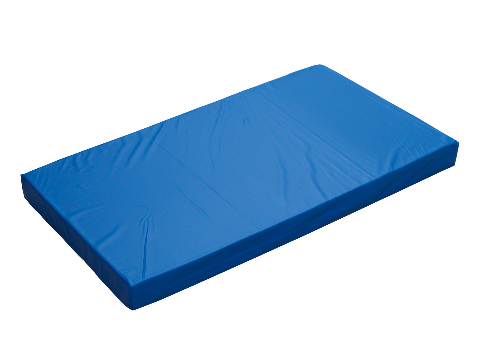 Svanenmärkt vilmadrass helt utan PVC med kallskumskärna. Blå. Mått: 117x54x4 cm utfälld, 117x27x8 cm ihopvikt. Blått fodral av 2-skiktsmaterial bestående av 49 % polyuretan och 51 % polyesterväv. Vattentät. Avtorkningsbar med våt trasa och maskintvätt i upp till 60 °C. Svanenmärkt, licensnummer 3031 0084.