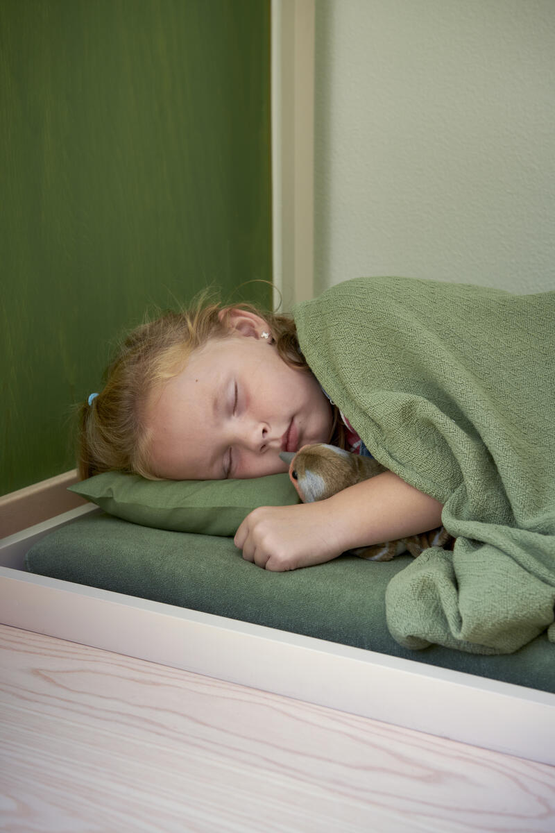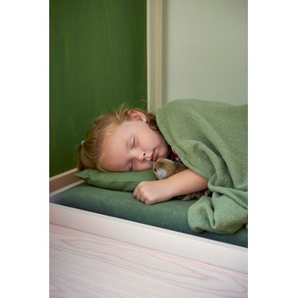 1 st Svanenmärkt madrass 140x55x7 cm i polyesterfiber, klädd med vattentät polyuretan/polyesterväv, tvättbar i upp till 90 grader. 1 st kudde 30x40 cm i polyesterfiber/bomullstyg, 1 st örngott i bomull, 1 st madrassöverdrag i stretchfrotté och 1 st bomullsfiltar 90x150 cm. Madrassen uppfyller brandklassning B-s1, d0. Polyesterfibern är 100 % återvinningsbar.