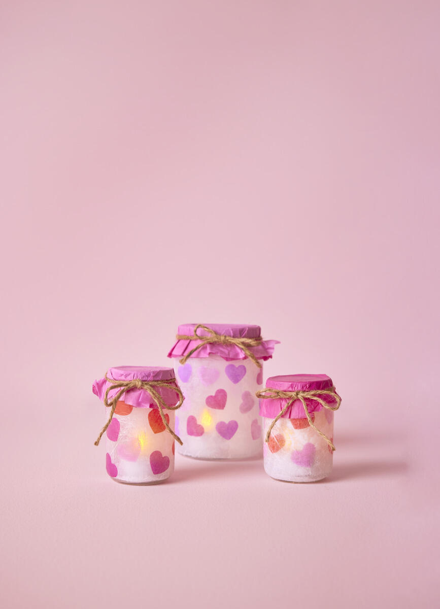 - Klistra fast hjärtanklistermärken på burken. Limma sedan fast vitt silkespapper över hela burken, så att hjärtanen skiner igenom. Måla burken med lack. Låt torka!