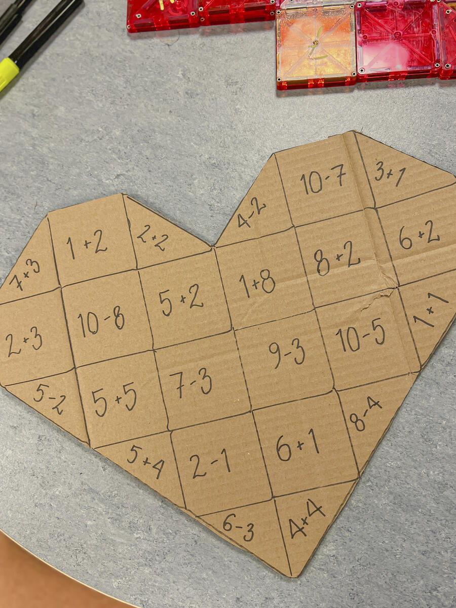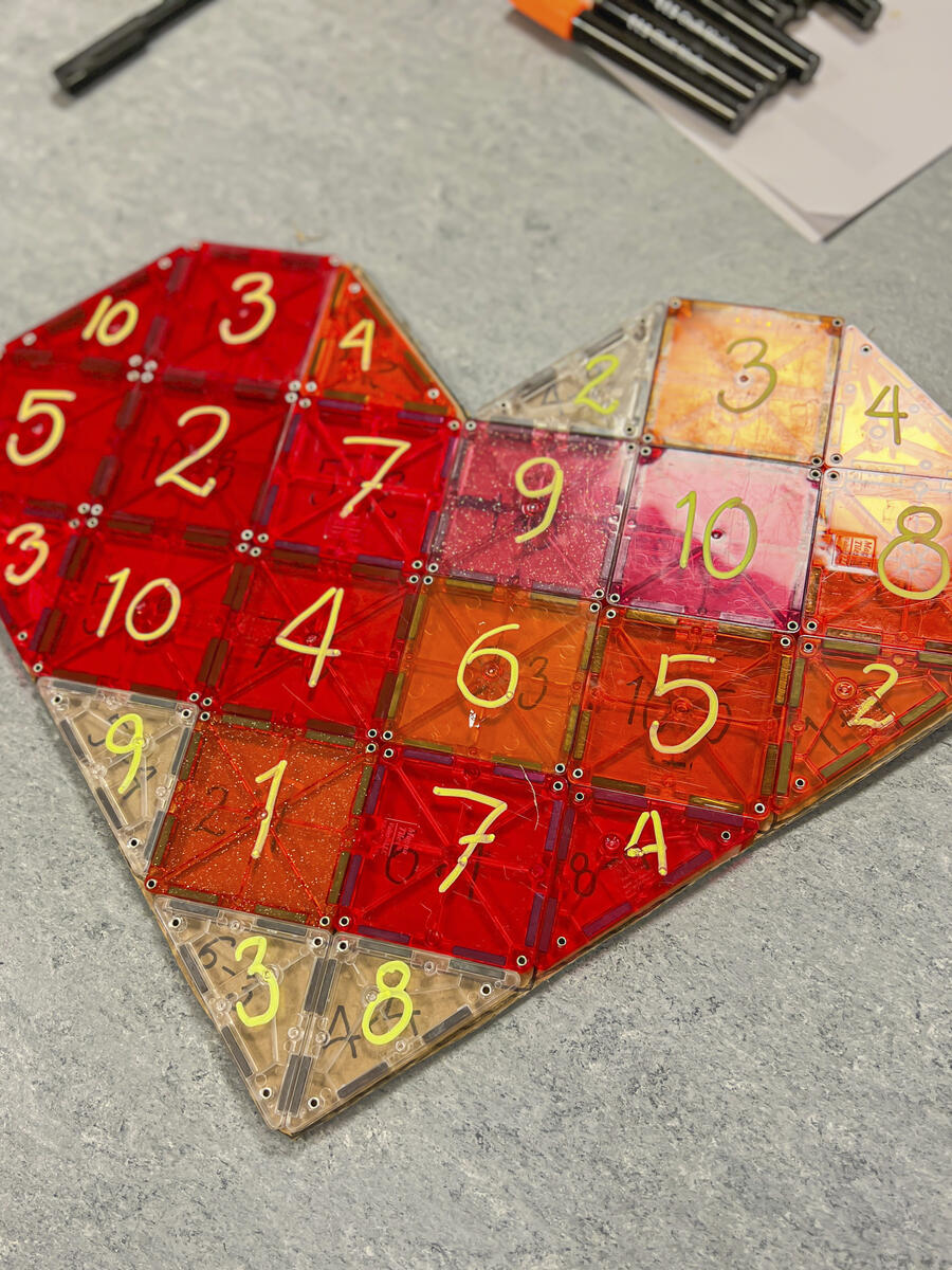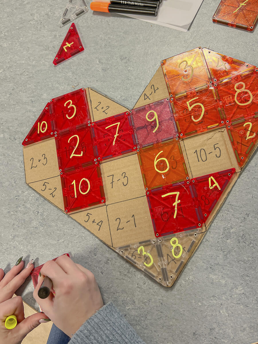 - Börja med att bygga ett hjärta av brickor från Magna-Tiles på en bit kartong.