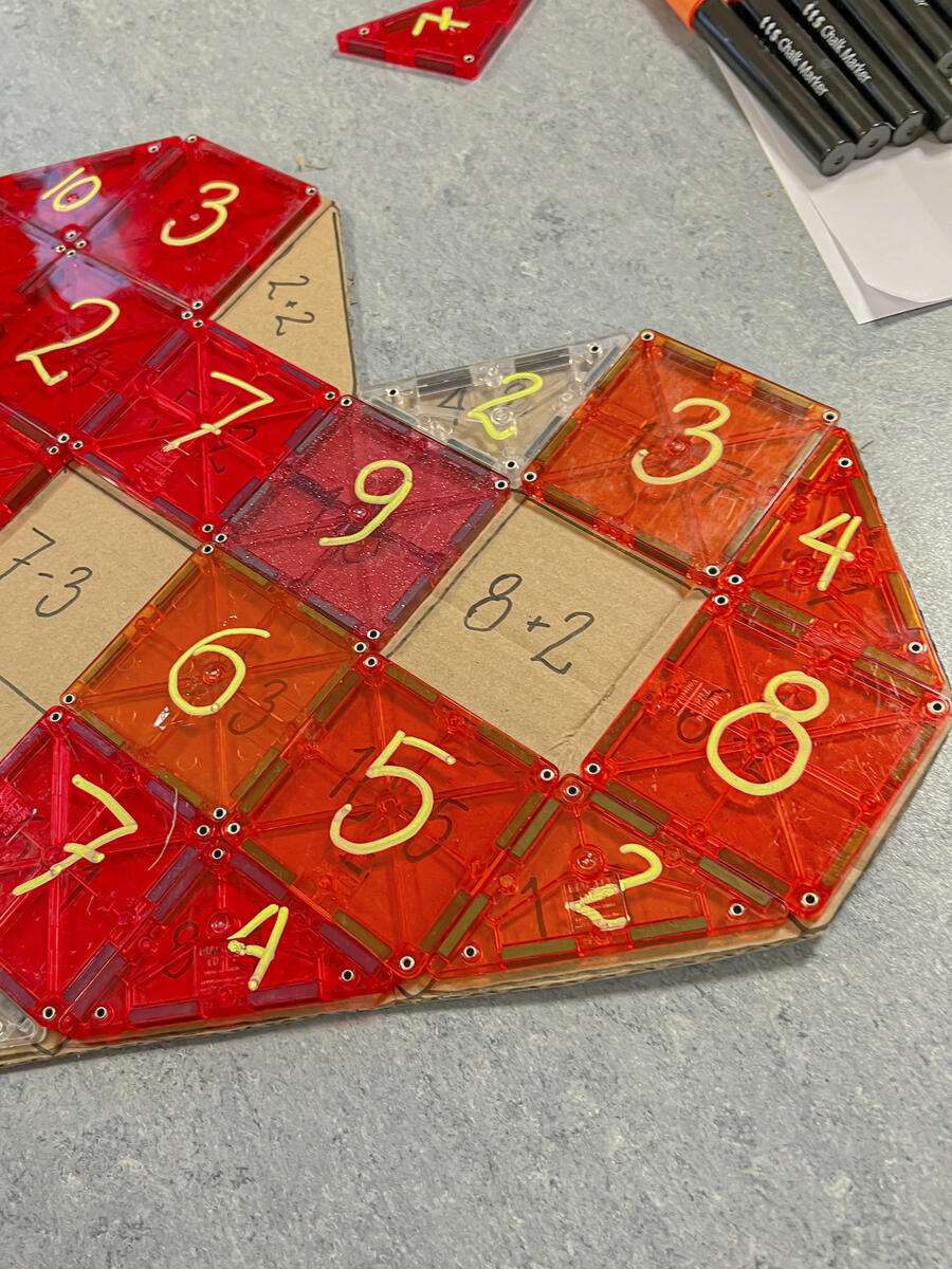 - Fyll rutorna med olika mattetal. Passa på att samtidigt skriva svaret på en bricka med samma form.