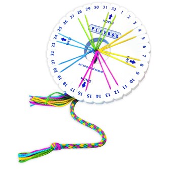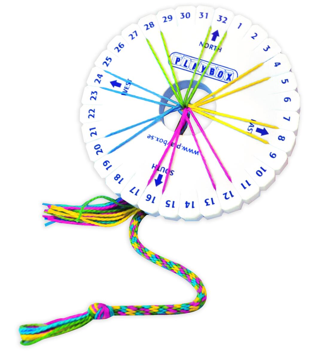 På fläthjulet ser du vilka mönster du kan göra. Du ser också hur många färger du behöver för varje mönster och hur dessa ska placeras när du börjar fläta.