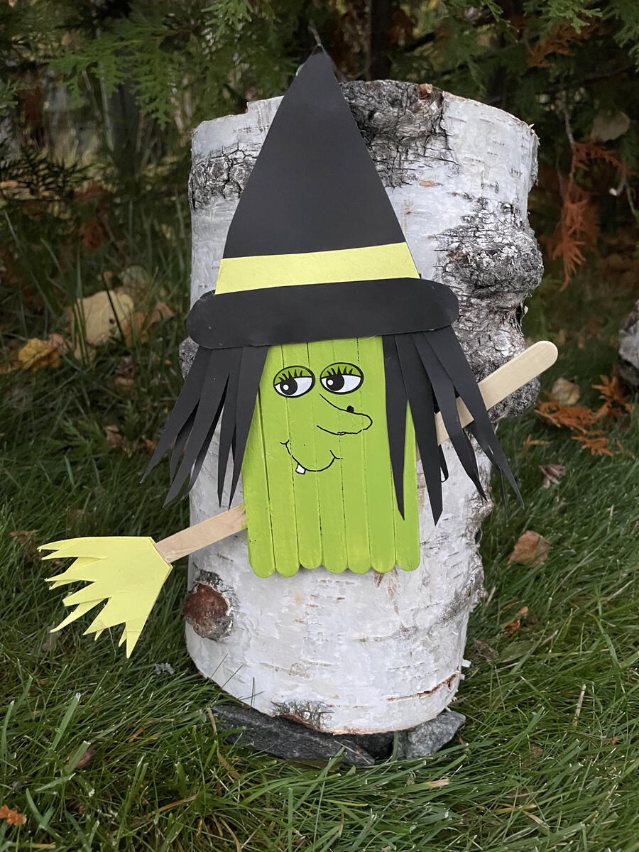 - Klipp ut en triangel av gult kartongark och klipp den fransig, limma fast på den utstickande glasspinnen så att det blir en kvast.