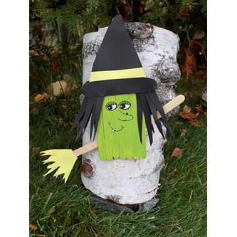 - Limma fast 2 glasspinnar på häxans baksida så att de sticker ut på båda sidor om häxan.