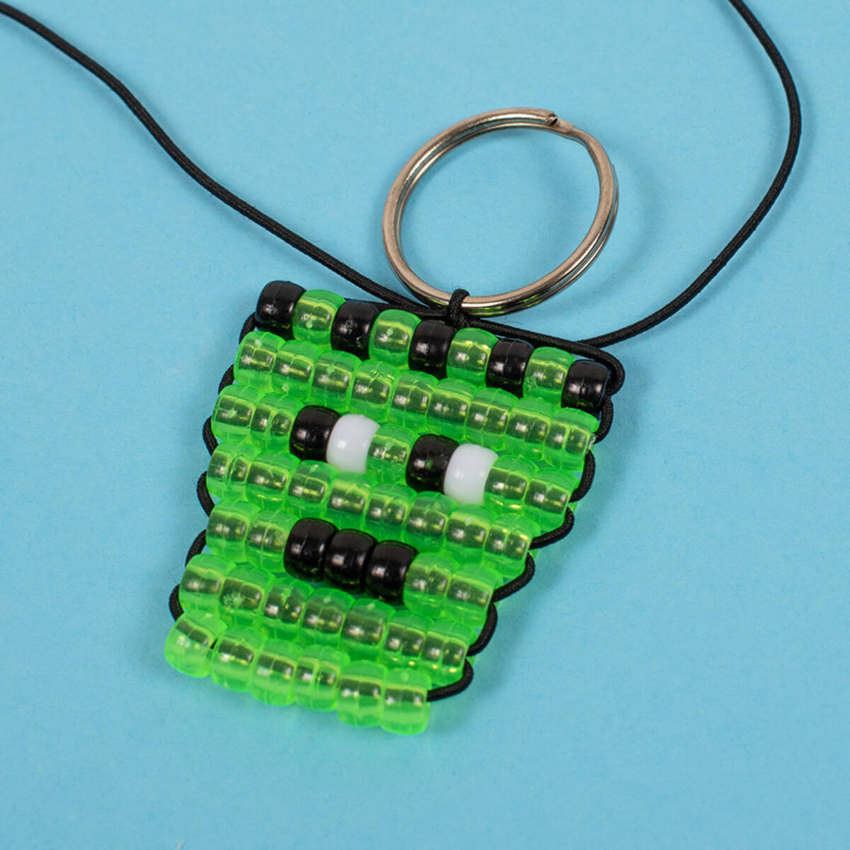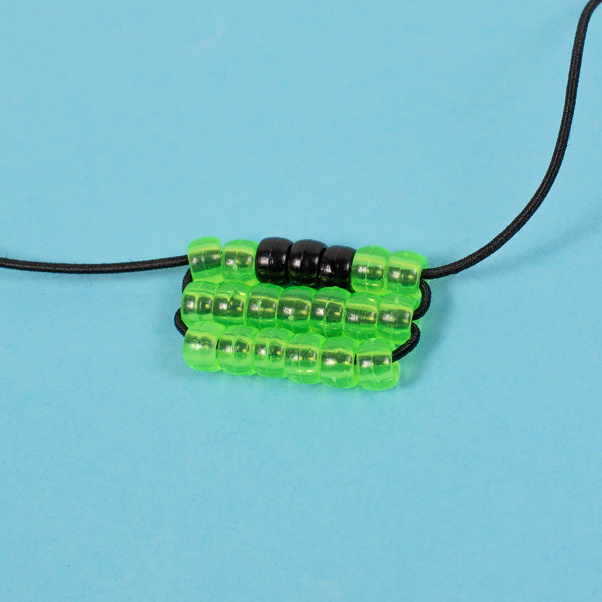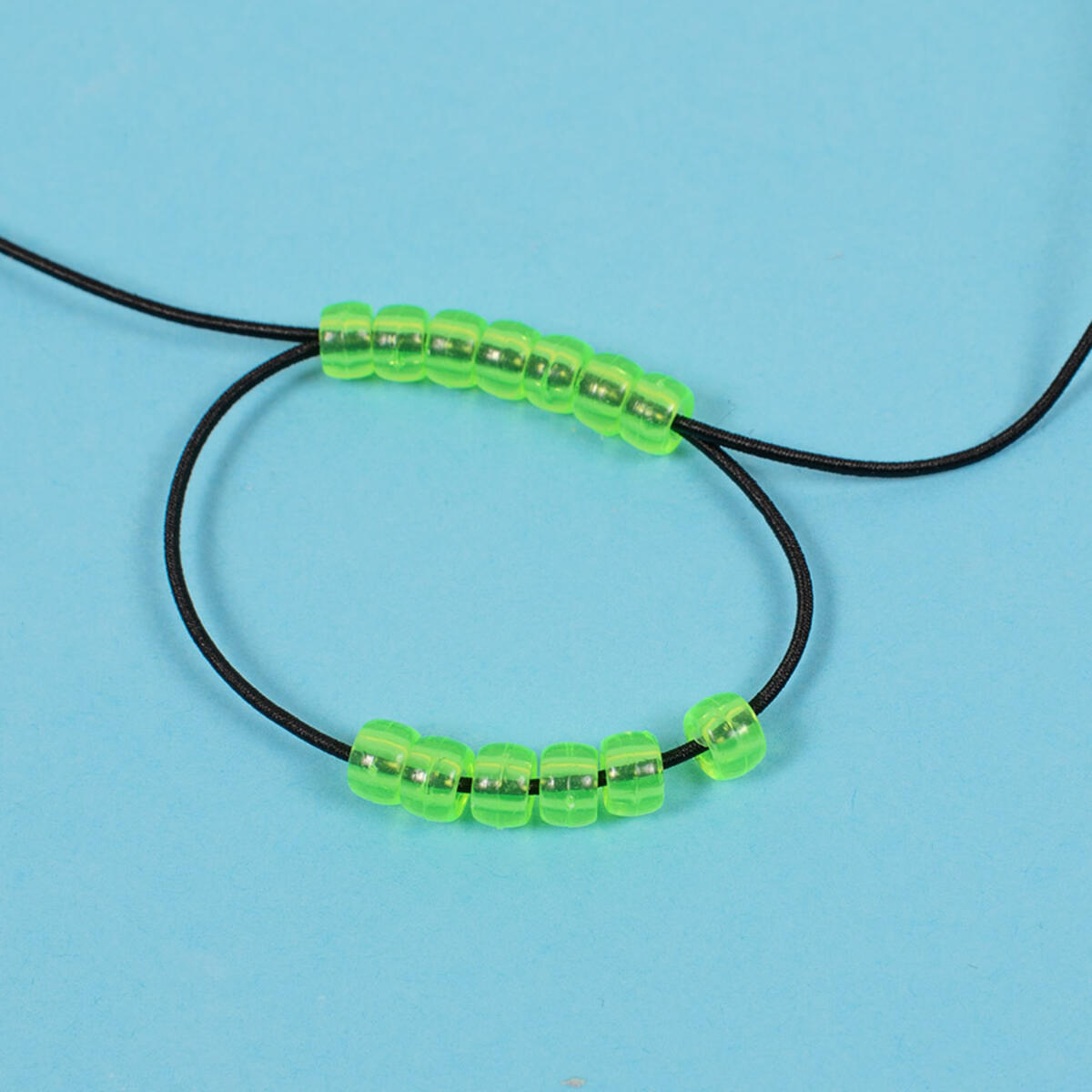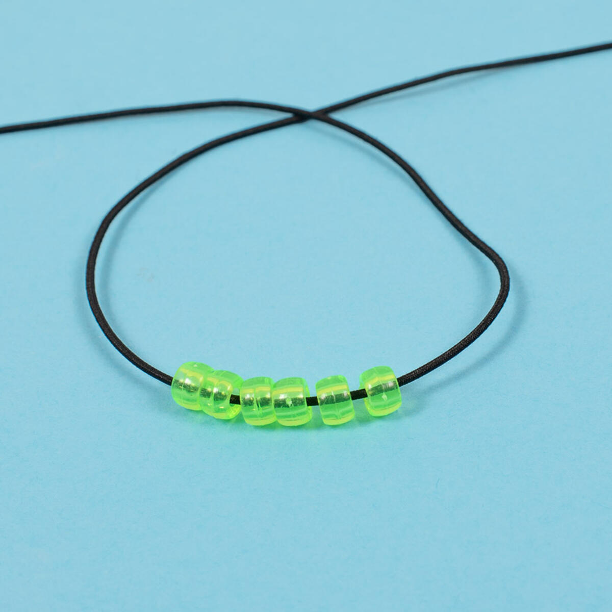 - Trä på 7 gröna pärlor på ena änden, trä andra änden genom samma 7 pärlor.