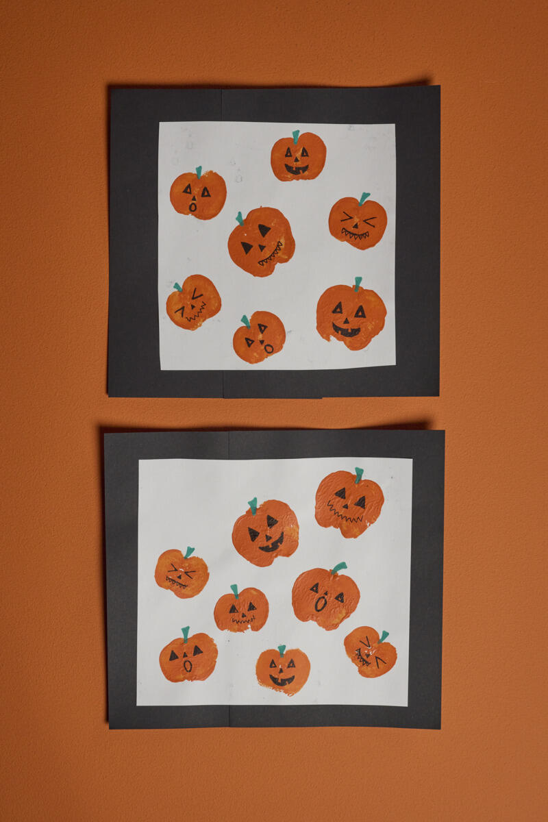 - Dela ett äpple på mitten och doppa i orange färg. Gör flera tryck på det vita pappret och låt torka.