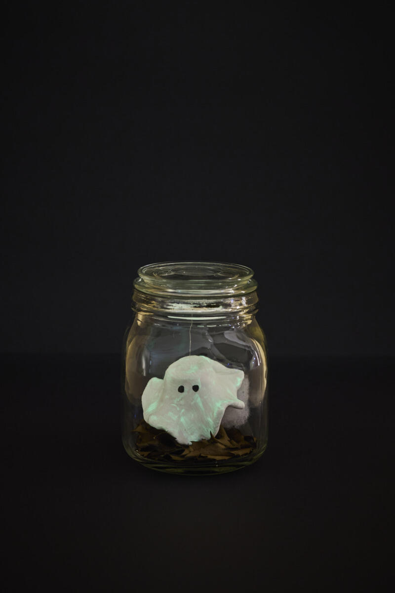 - Trä en tråd genom spökets topp och fäst i locket på en glasburk.
