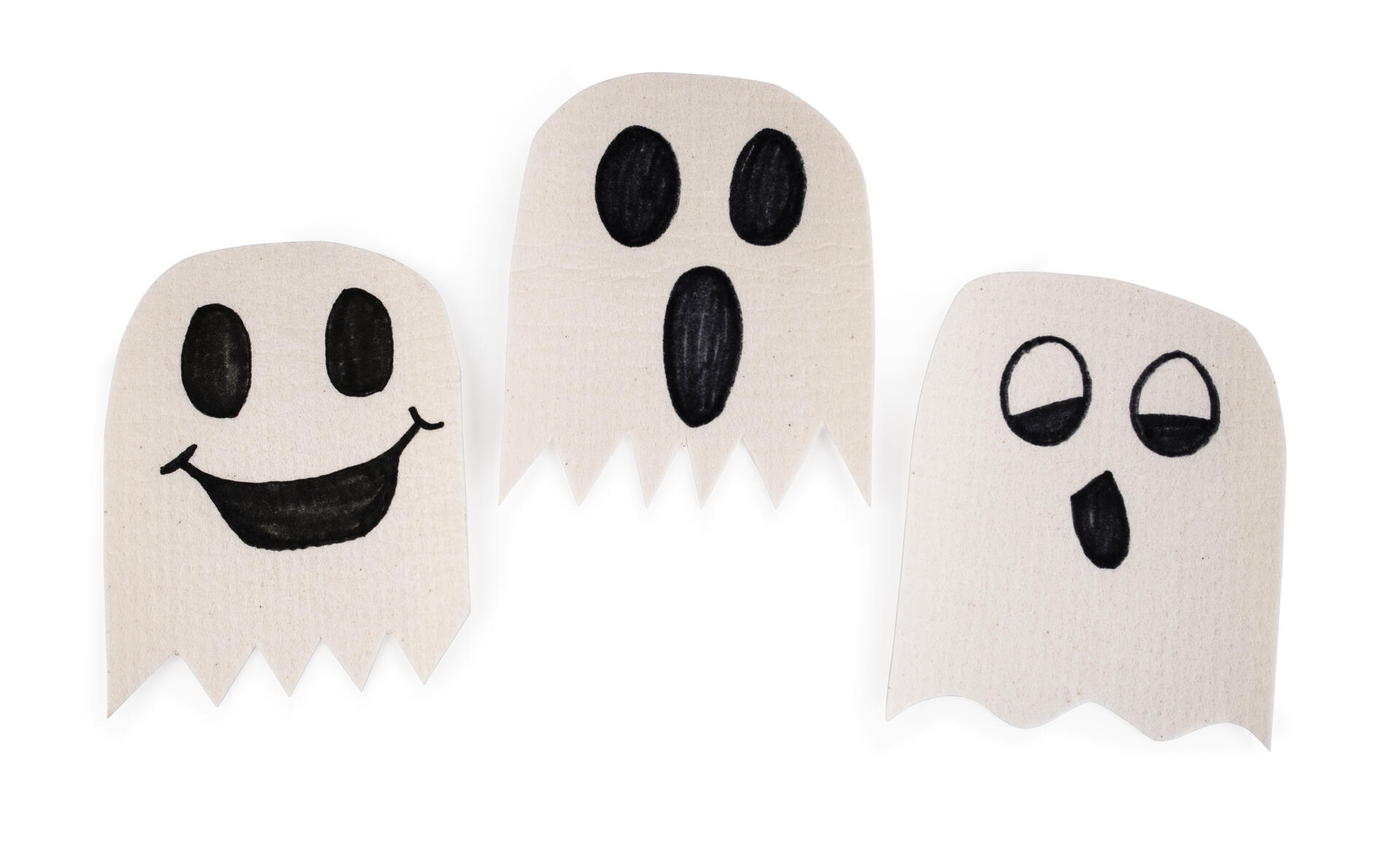 - Ta en vit diskduk och måla ett spökansikte med en textilfiberpenna eller textilfärg.