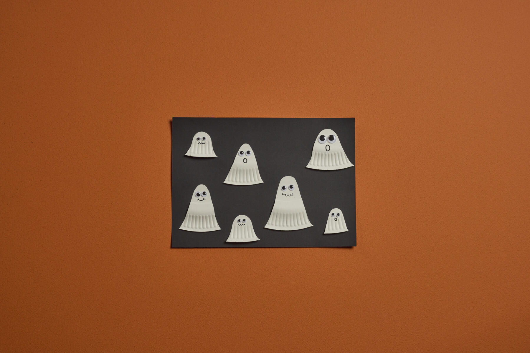 Ta fram ett svart A3-papper. Klipp ut formen av spöken från en vit papptallrik. Fäst med lim på det svarta pappret. Fäst ögon på de vita spökena med hjälp av lim och rita även dit en mun med svart penna. Du har nu en kuslig spöktavla!