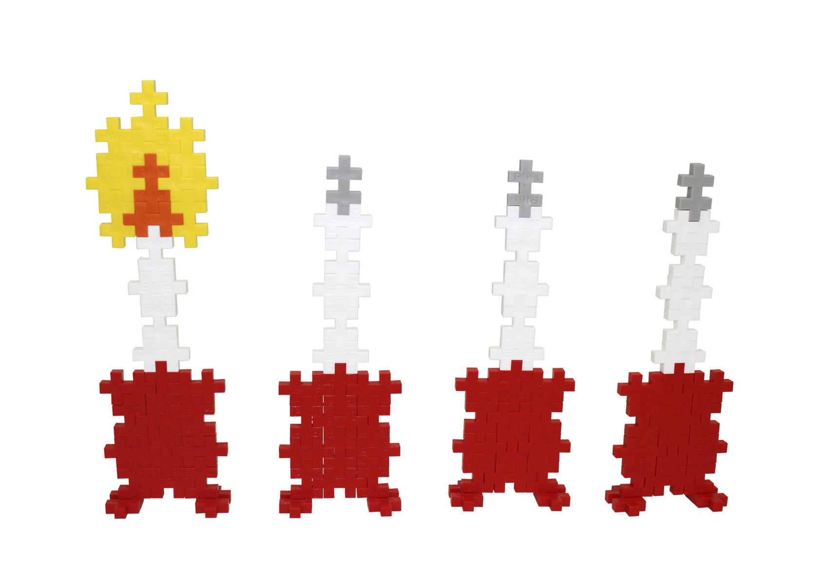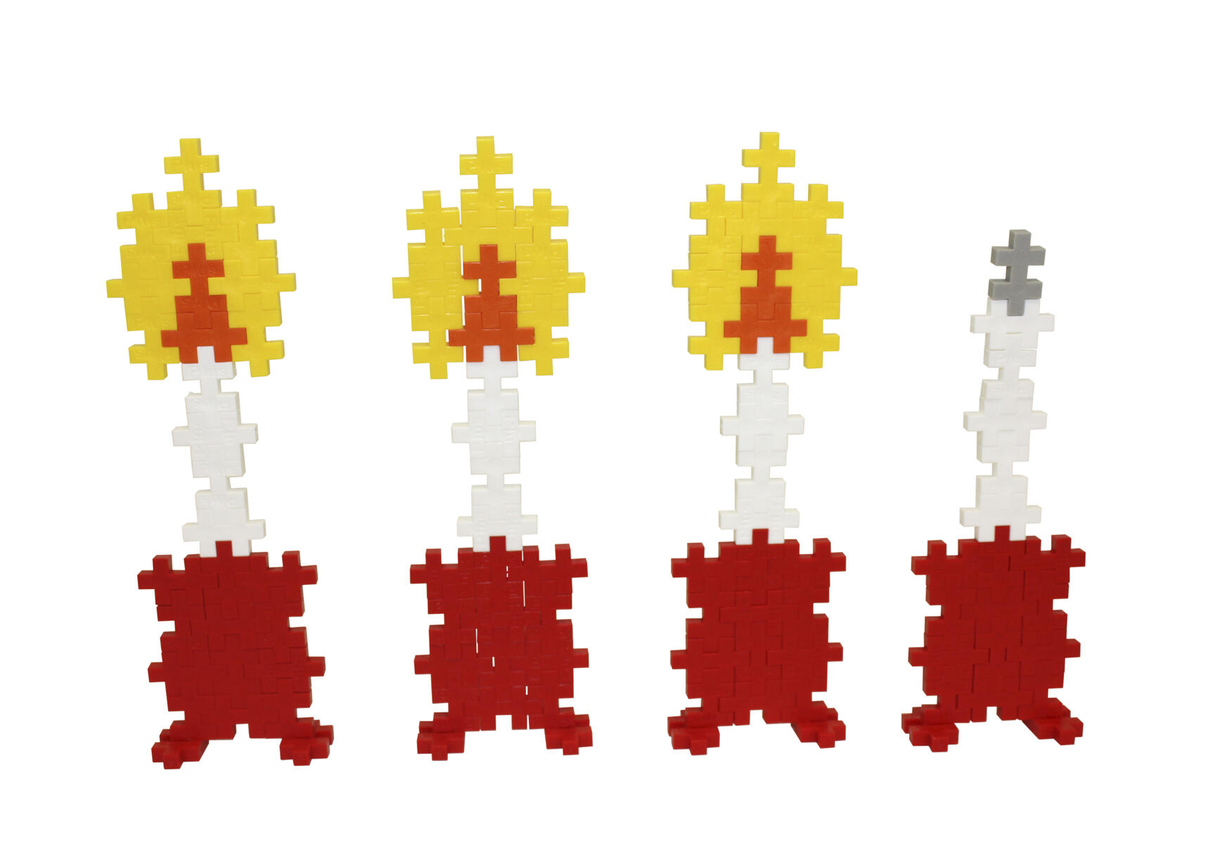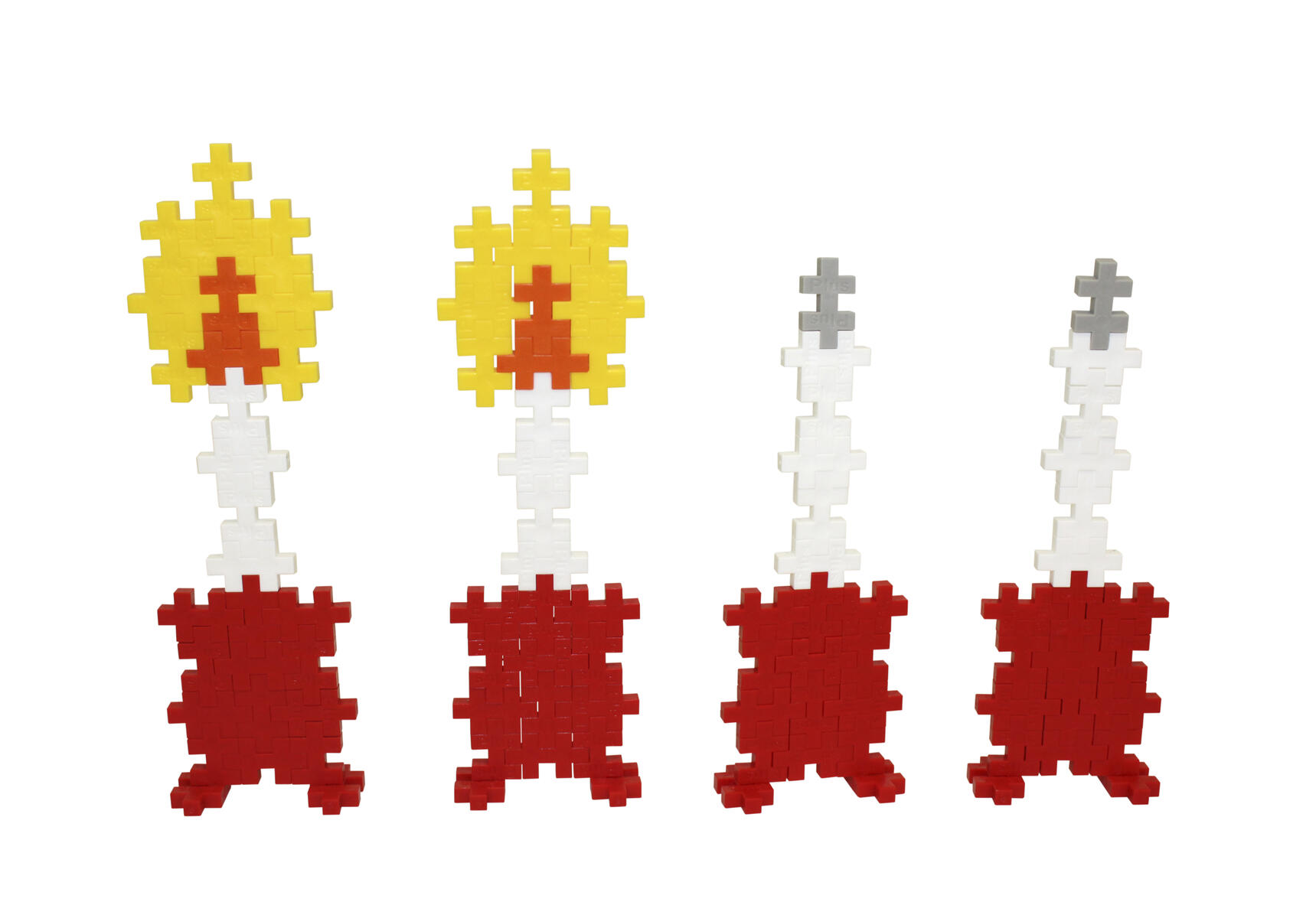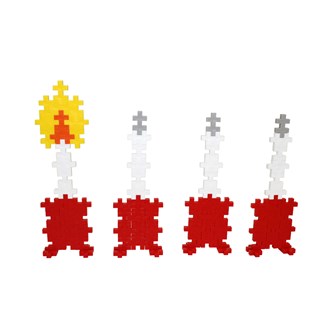 - Ska ljuset vara släckt plockas de gula och orangea PLUS-PLUS-bitarna bort och ersätts av en extra vit och en grå i toppen.