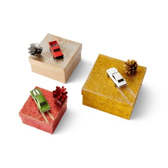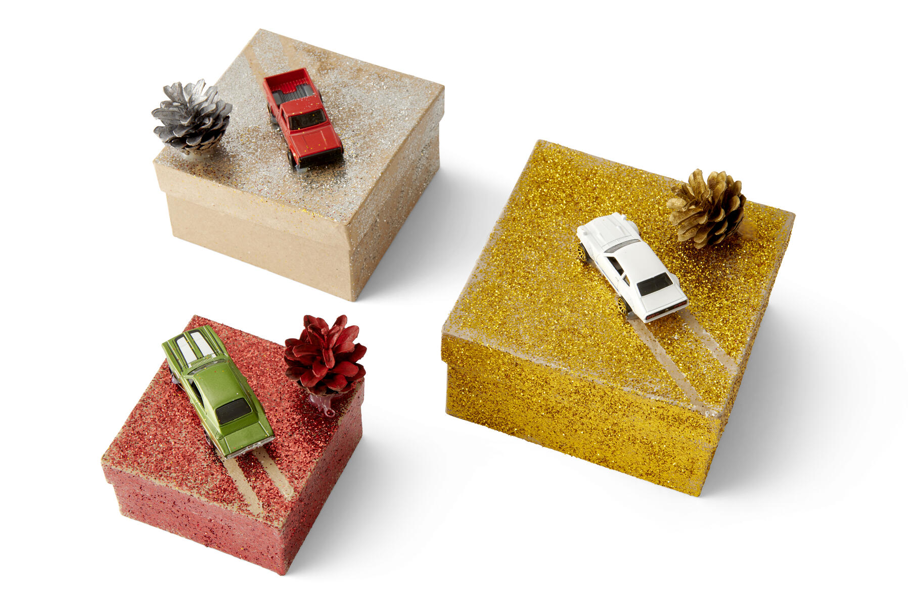 Limma sedan hela asken med flytande lim och strö på glitterströssel, låt torka. Dra sedan bort den dubbelhäftande tejpen och placera bilen på asken.