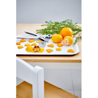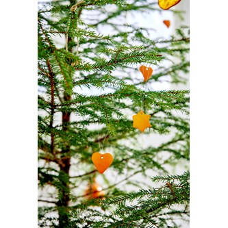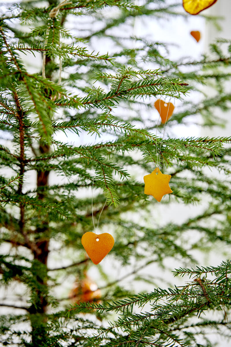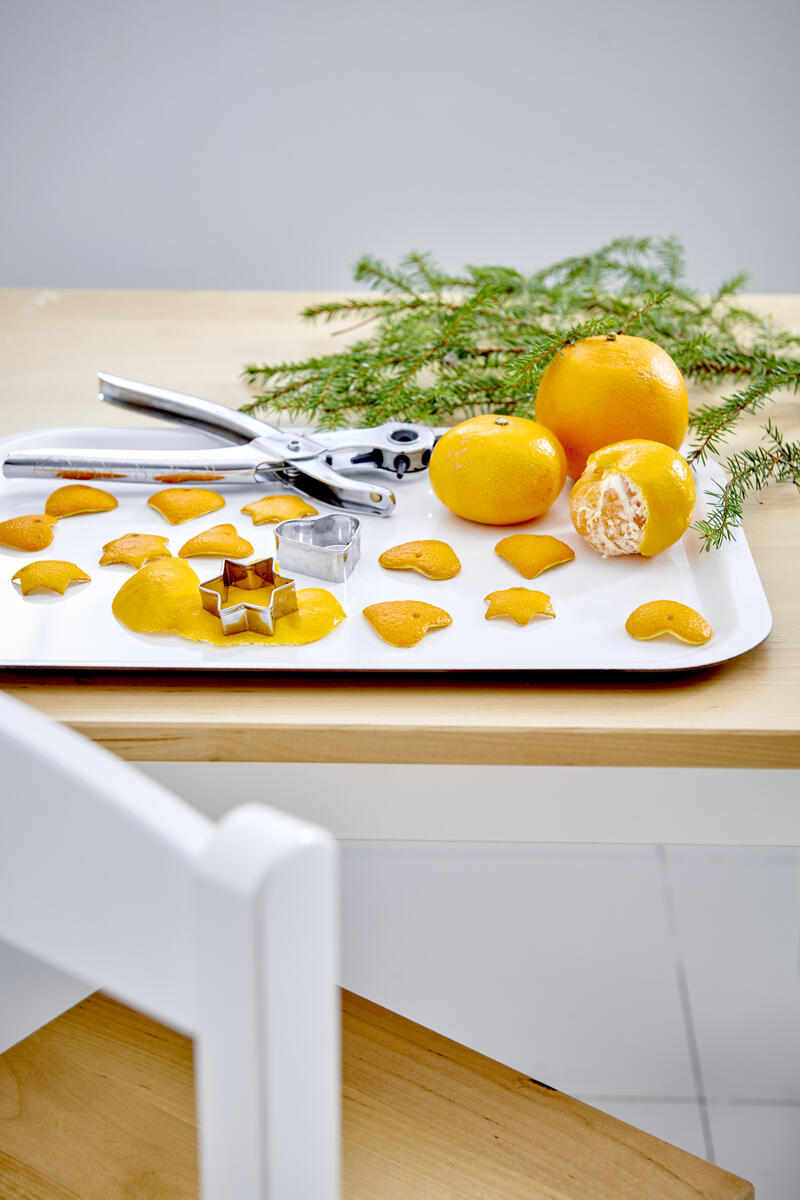 1. Använd skalen från fruktstundens clementiner eller apelsiner, platta ut dem och använd små pepparkaksmått för att trycka ut former.