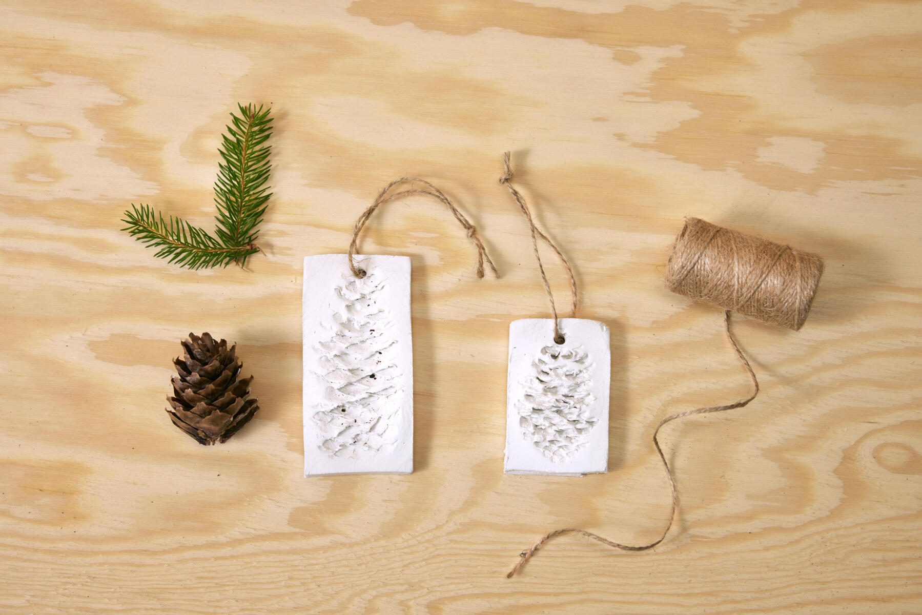 - Gör mönster genom att trycka en kotte mot leran. Skär sedan till önskad form och gör ett hål för upphängning. Låt torka.