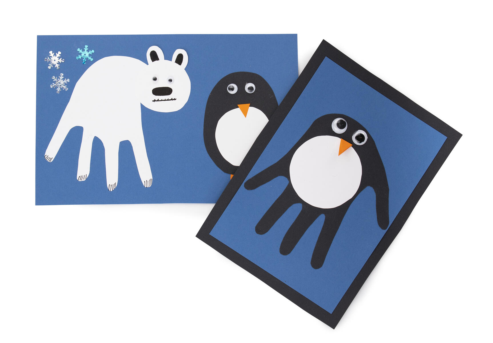 - Kort 2: Vik ett A4-papper på mitten och klistra fast på ett svart ark (så att det bildar en ram). På kortet klistrar man sedan fast en utklippt hand. Måla sedan eller klipp ut pingvinens bröst av papper.