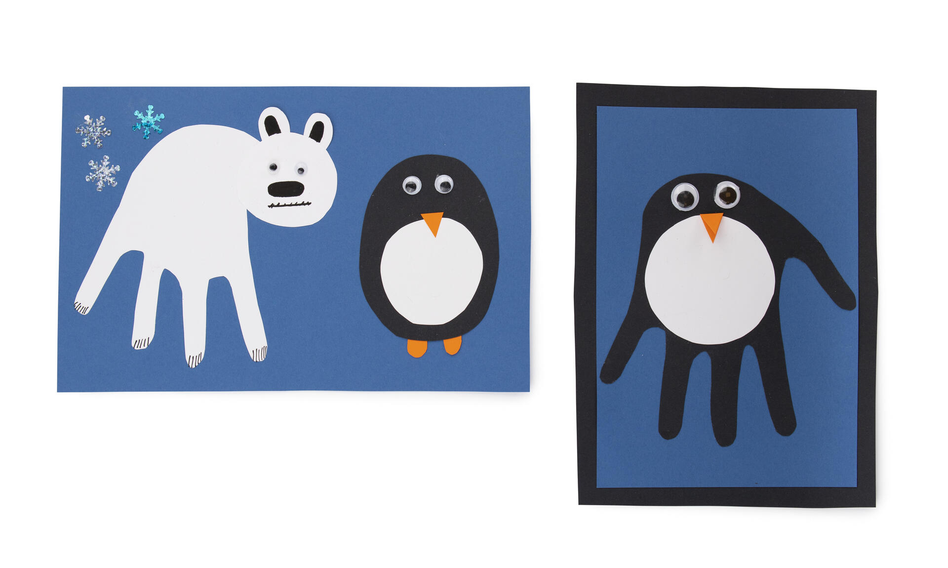 - Rita sedan dit klor och ansikte på isbjörnen. Klipp ut pingvinens kropp och klistra fast på A4-arket.
