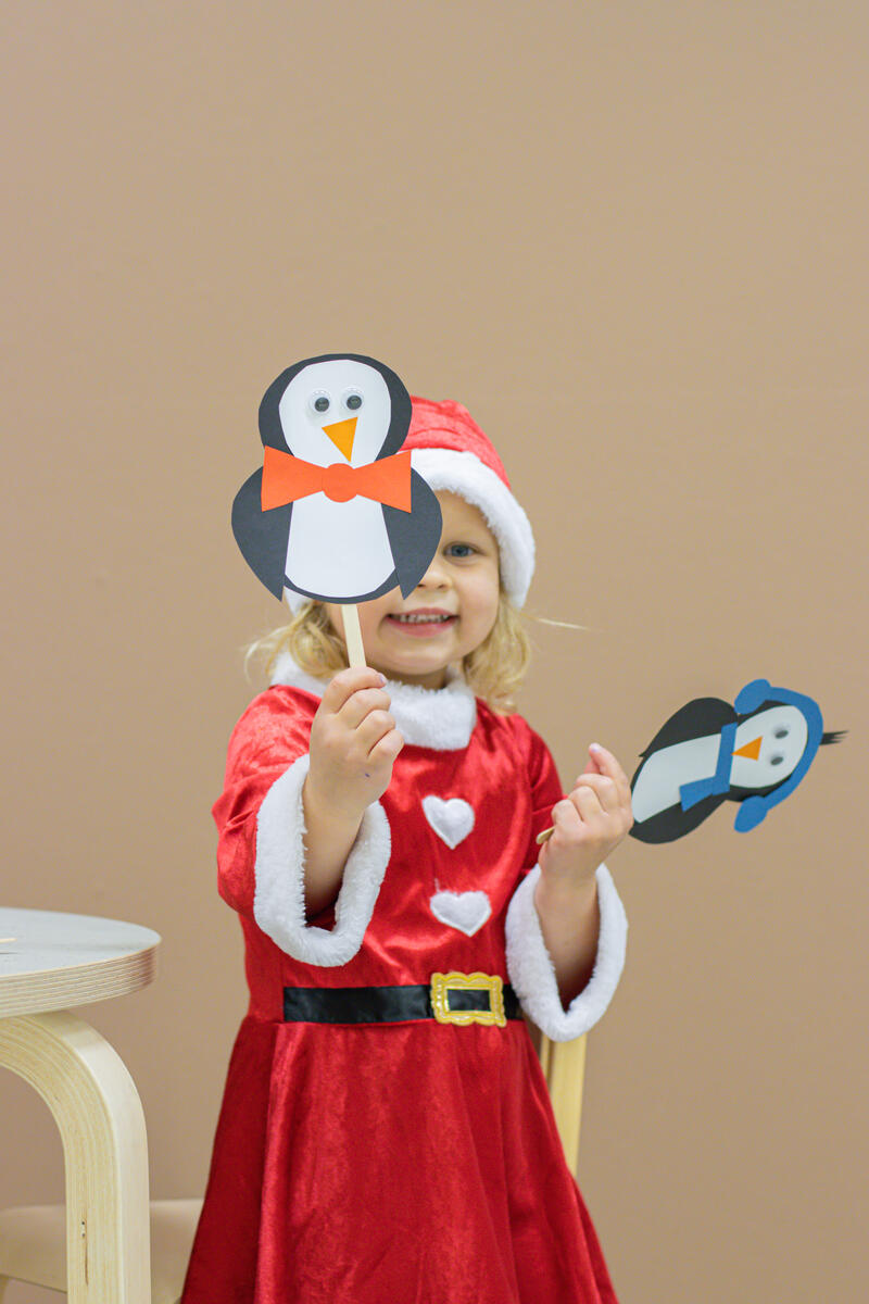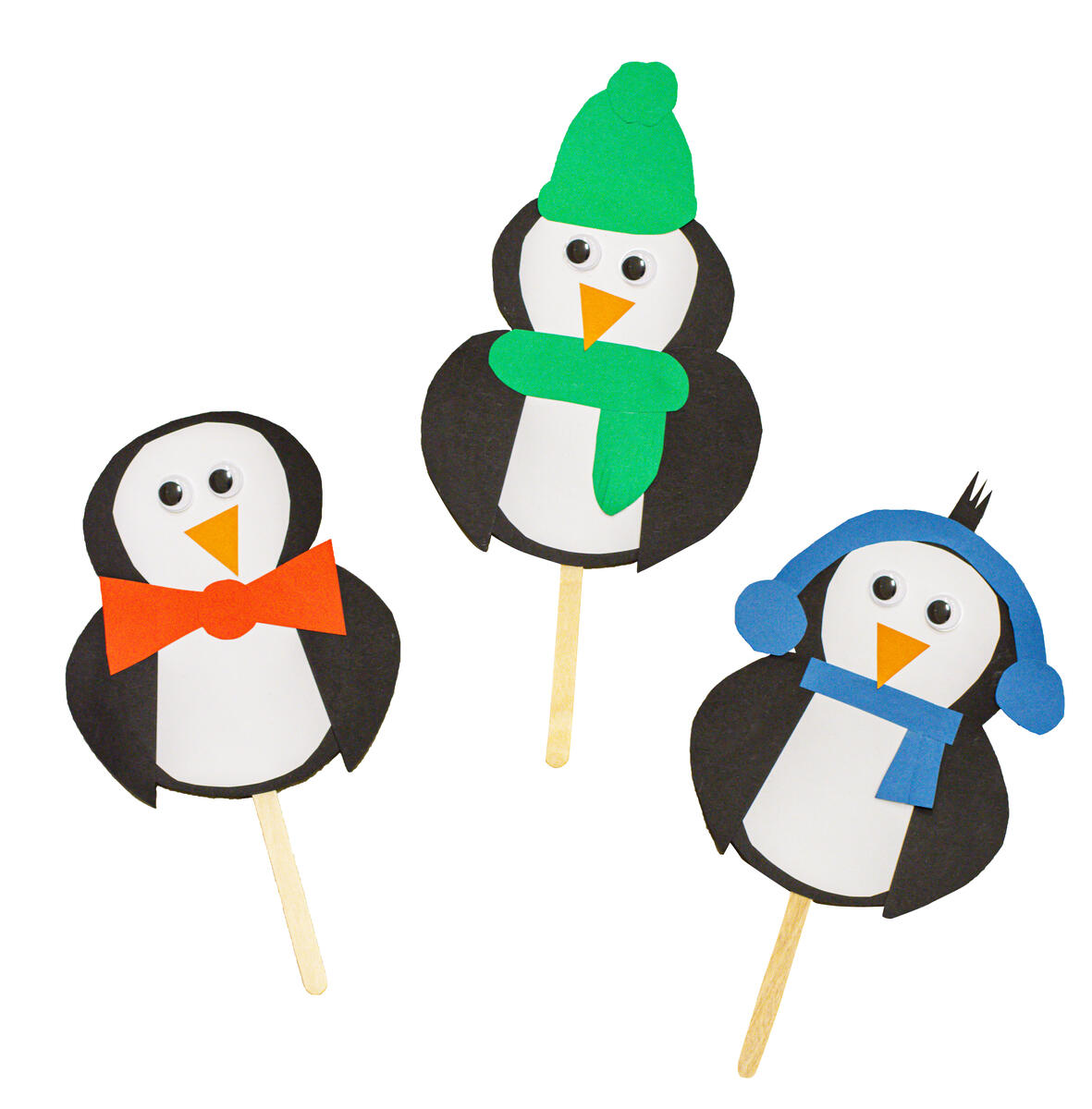 - Skapa mössa, halsduk, öronmuffar, fluga och hår genom att klippa ut detta från svart, rött, blått och grönt papper och limma fast på pingvinen.